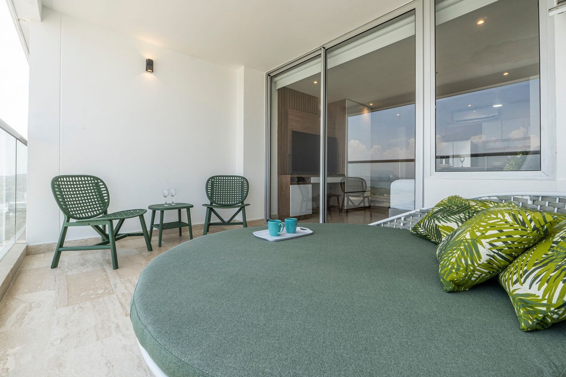 • Balcón XL con daybed redondo + mesa y sillas • Cama Queen + sofá cama, capacidad hasta 3 huéspedes