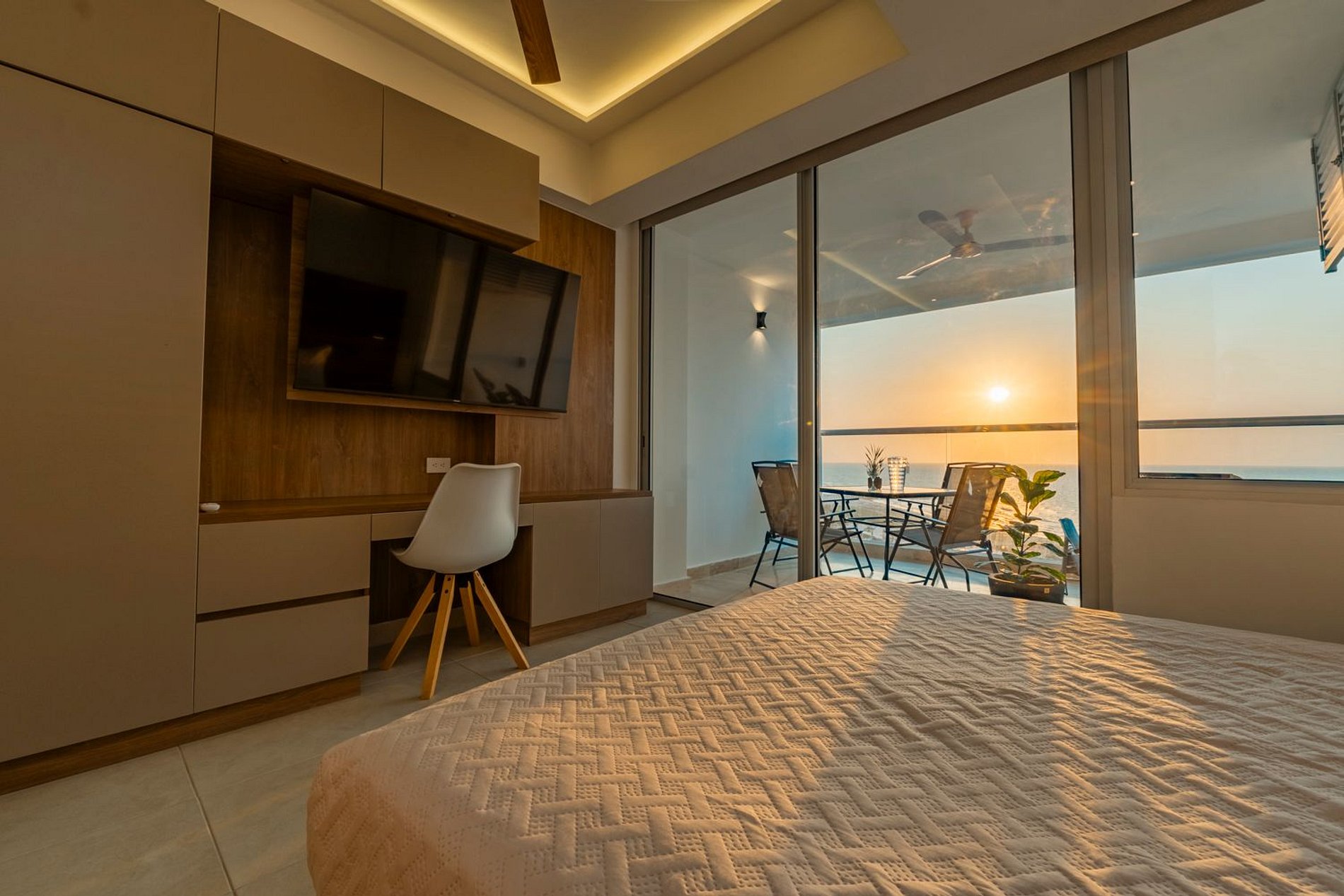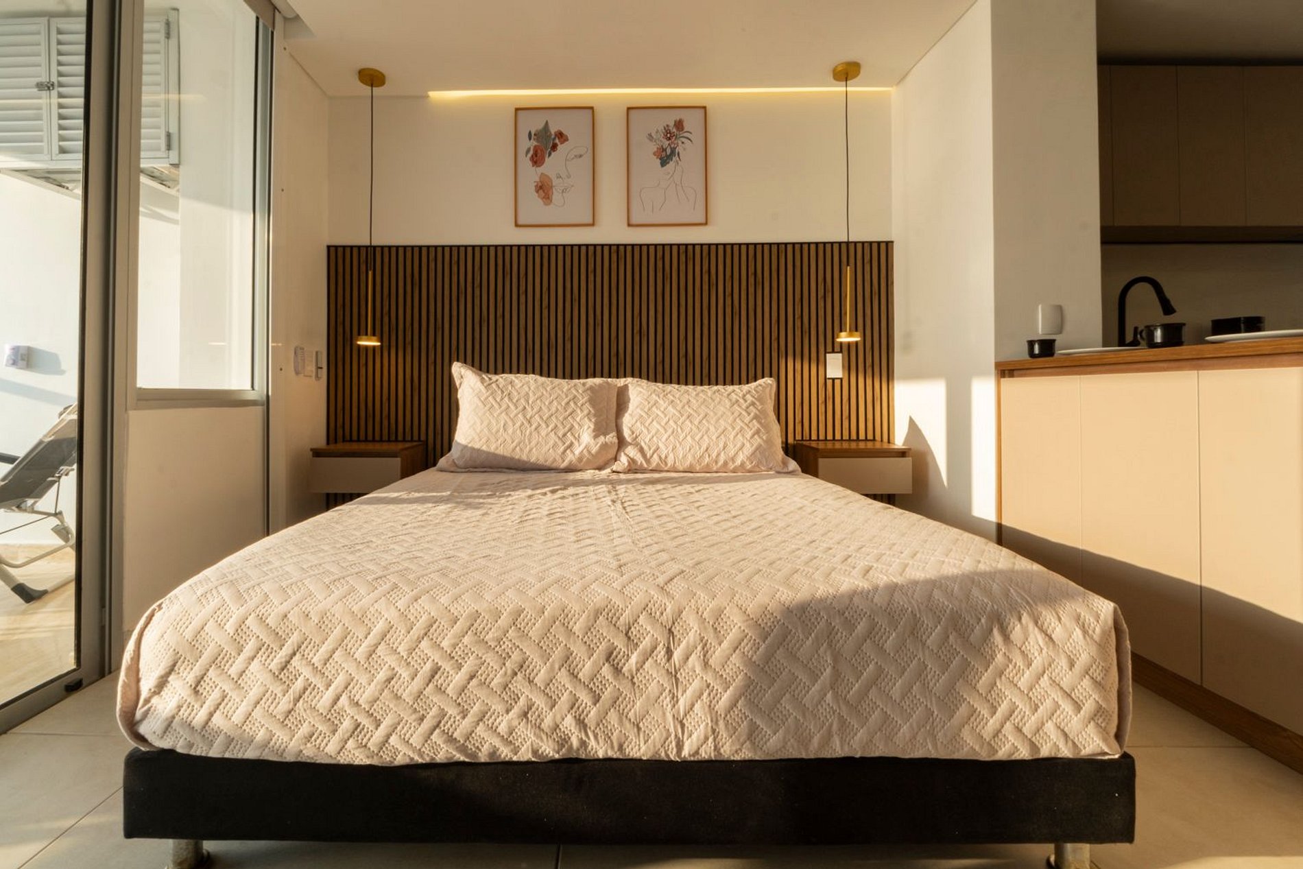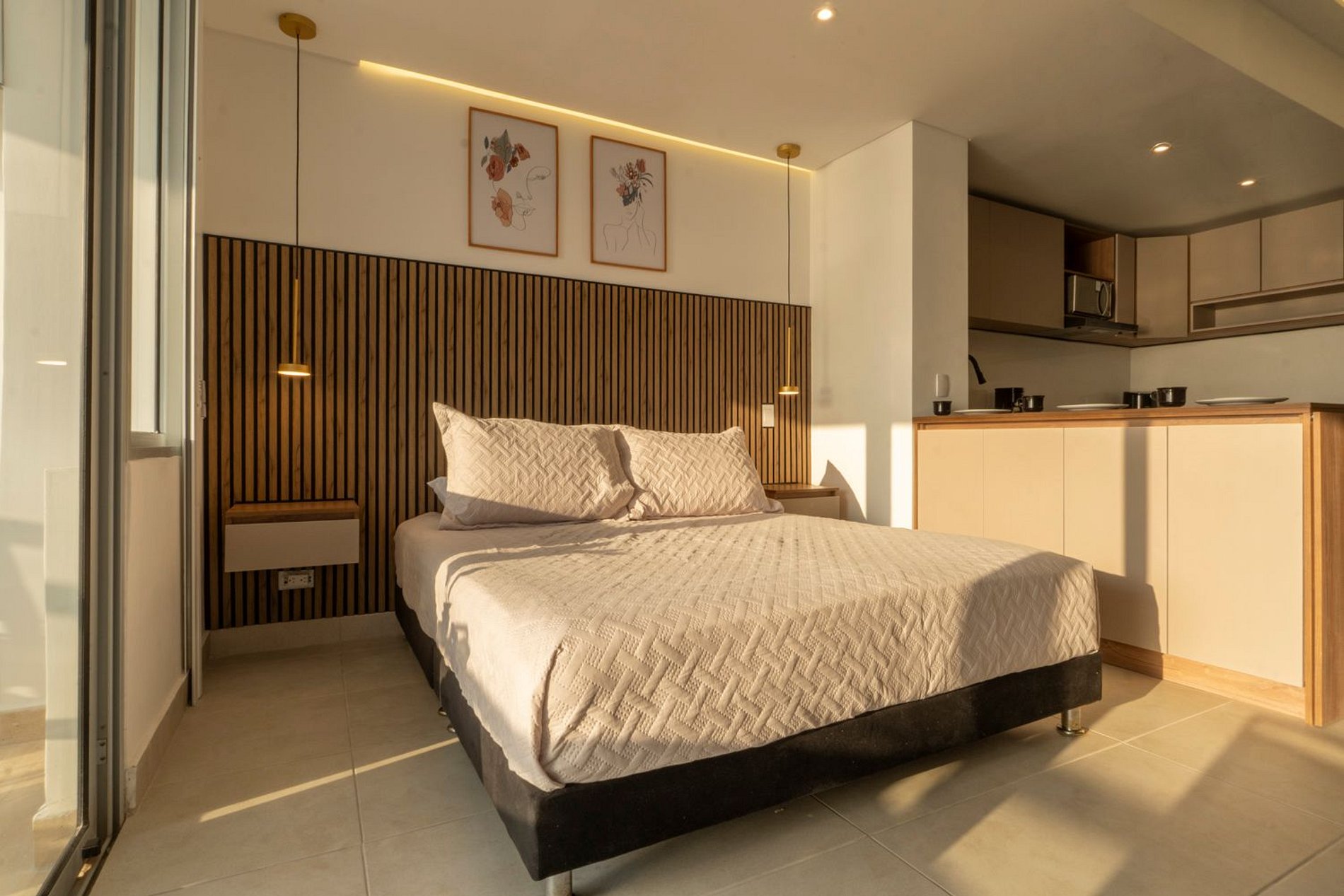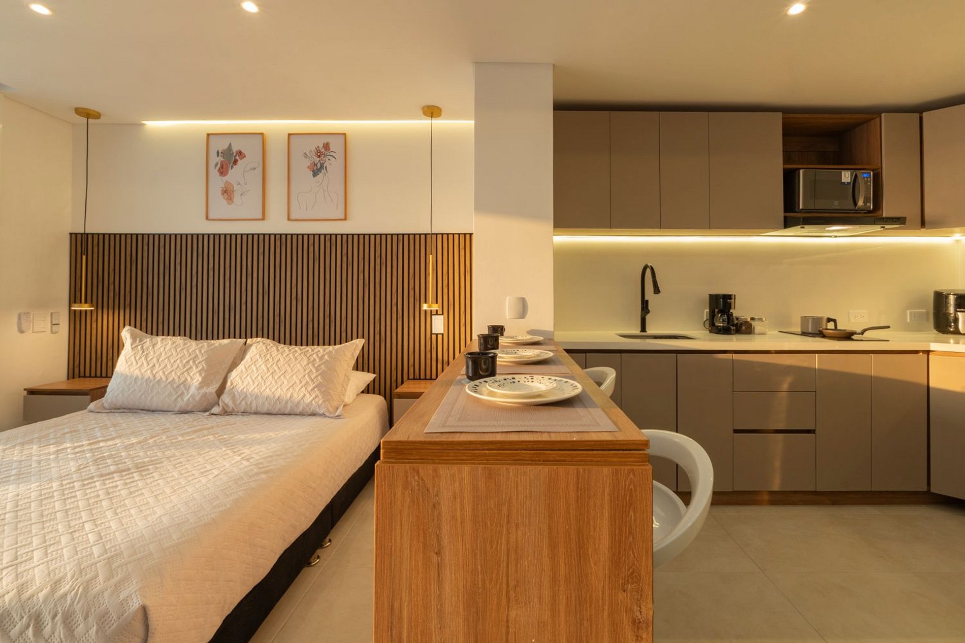 Suite moderna con cama Queen, cocina equipada, baño en mármol, sala con sofá cama y balcón amoblado con vista al mar.