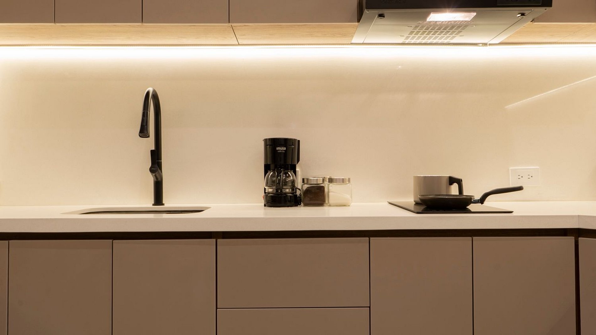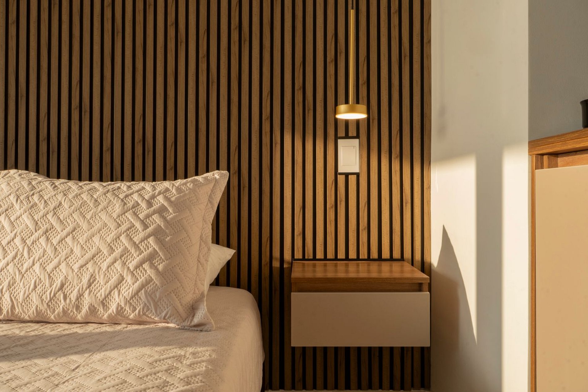 • Decoración moderna con madera cálida y luz natural que crea un ambiente acogedor.