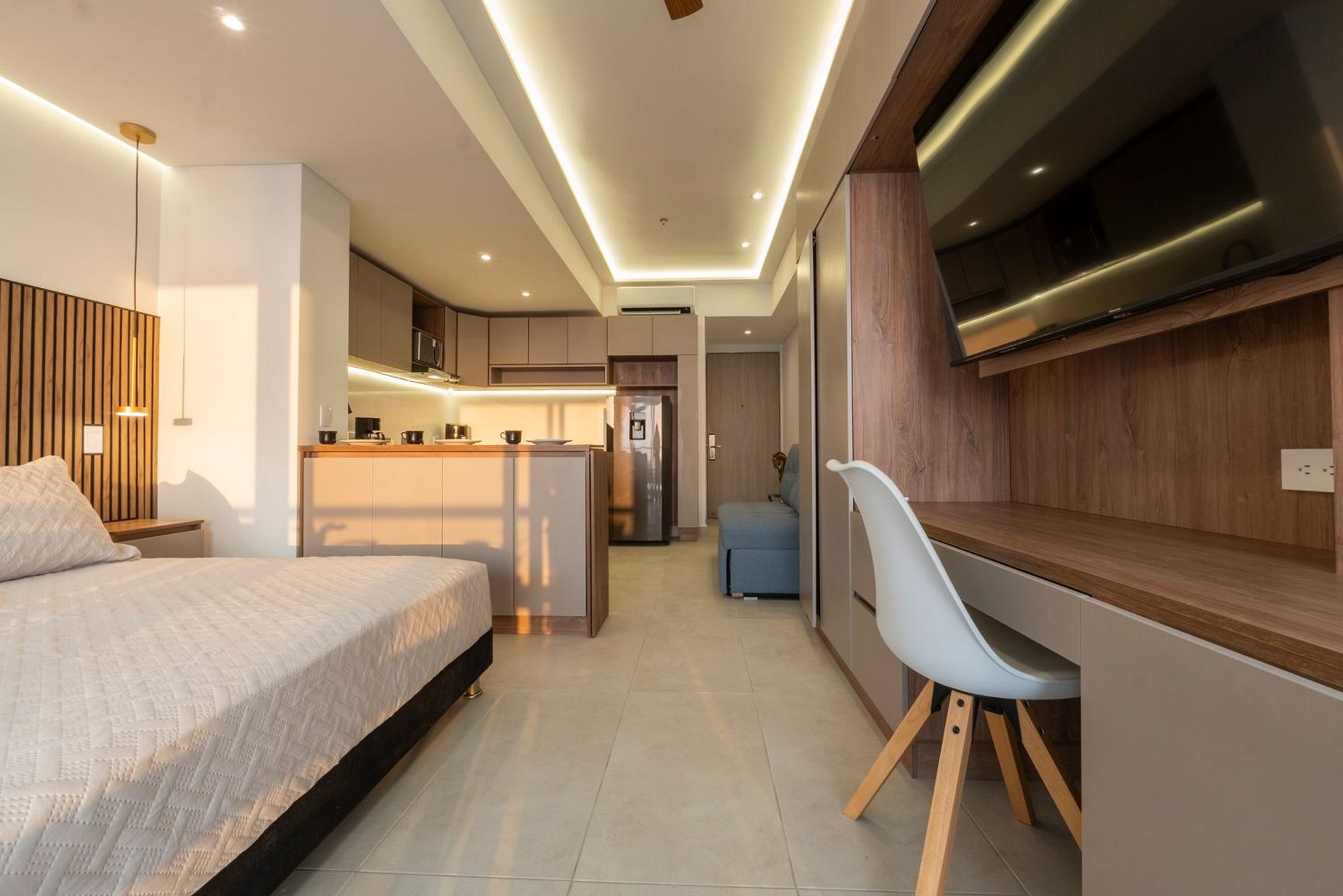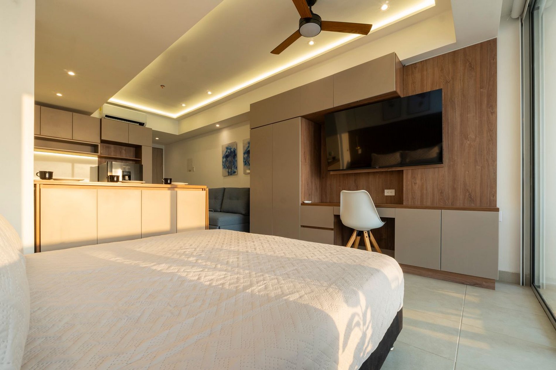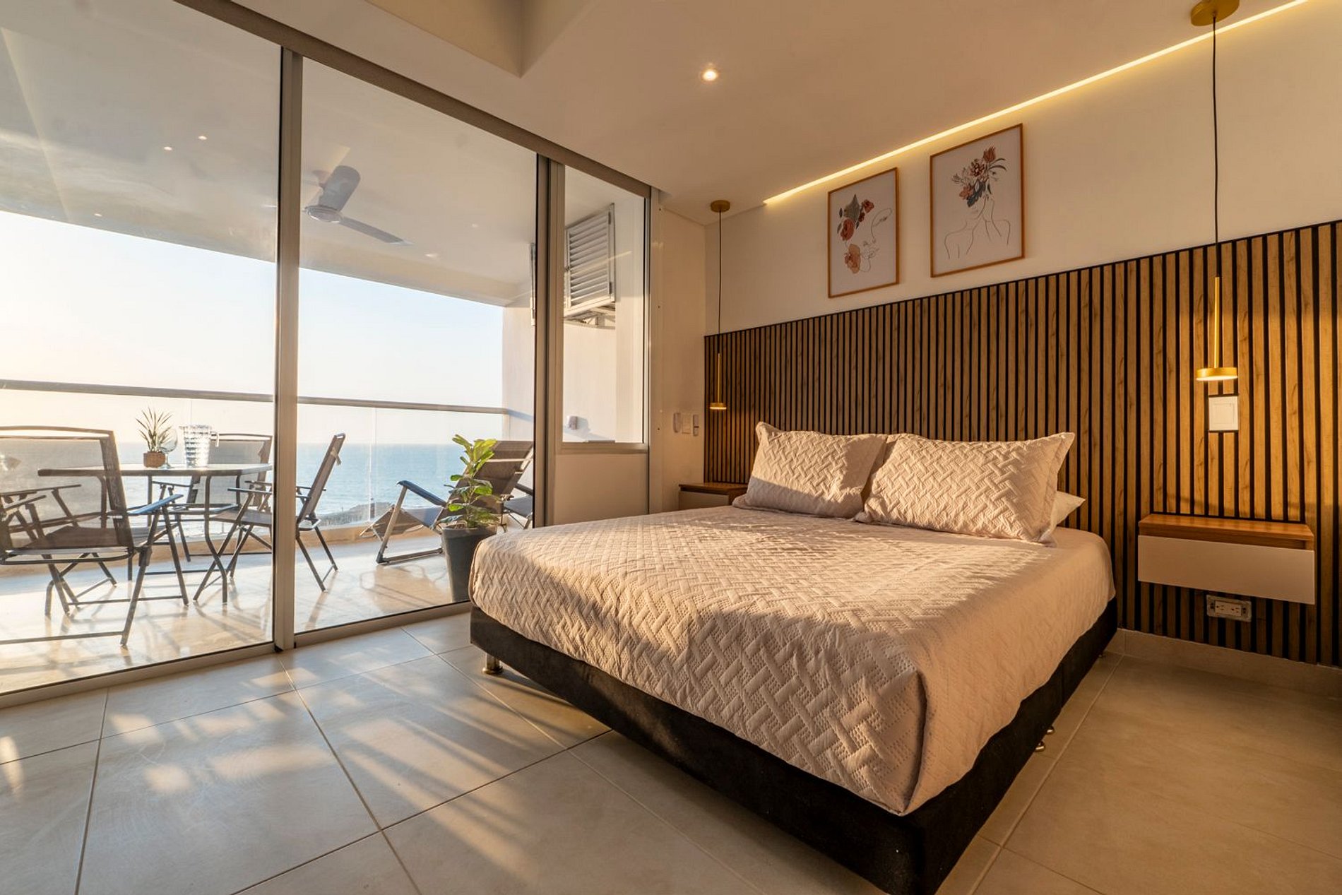 En el piso 9, esta maravillosa suite frente al mar combina diseño moderno y toques cálidos en madera. Disfruta de cama Queen, Smart TV, blackout y aire acondicionado. Relájate en el amplio balcón con mobiliario lounge y vistas únicas al atardecer. Cocina equipada con nevera, microondas, cafetera, menaje completo y lavadora/secadora. Baño elegante en mármol con ducha tipo spa. El edificio ofrece piscina, jacuzzi, sauna, turco, gimnasio y recepción 24/7 junto a la playa. A 2 min del aeropuerto
