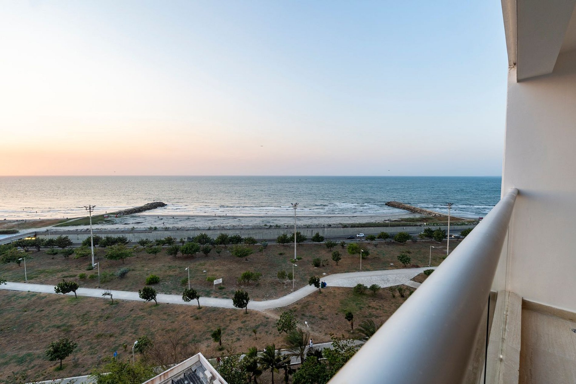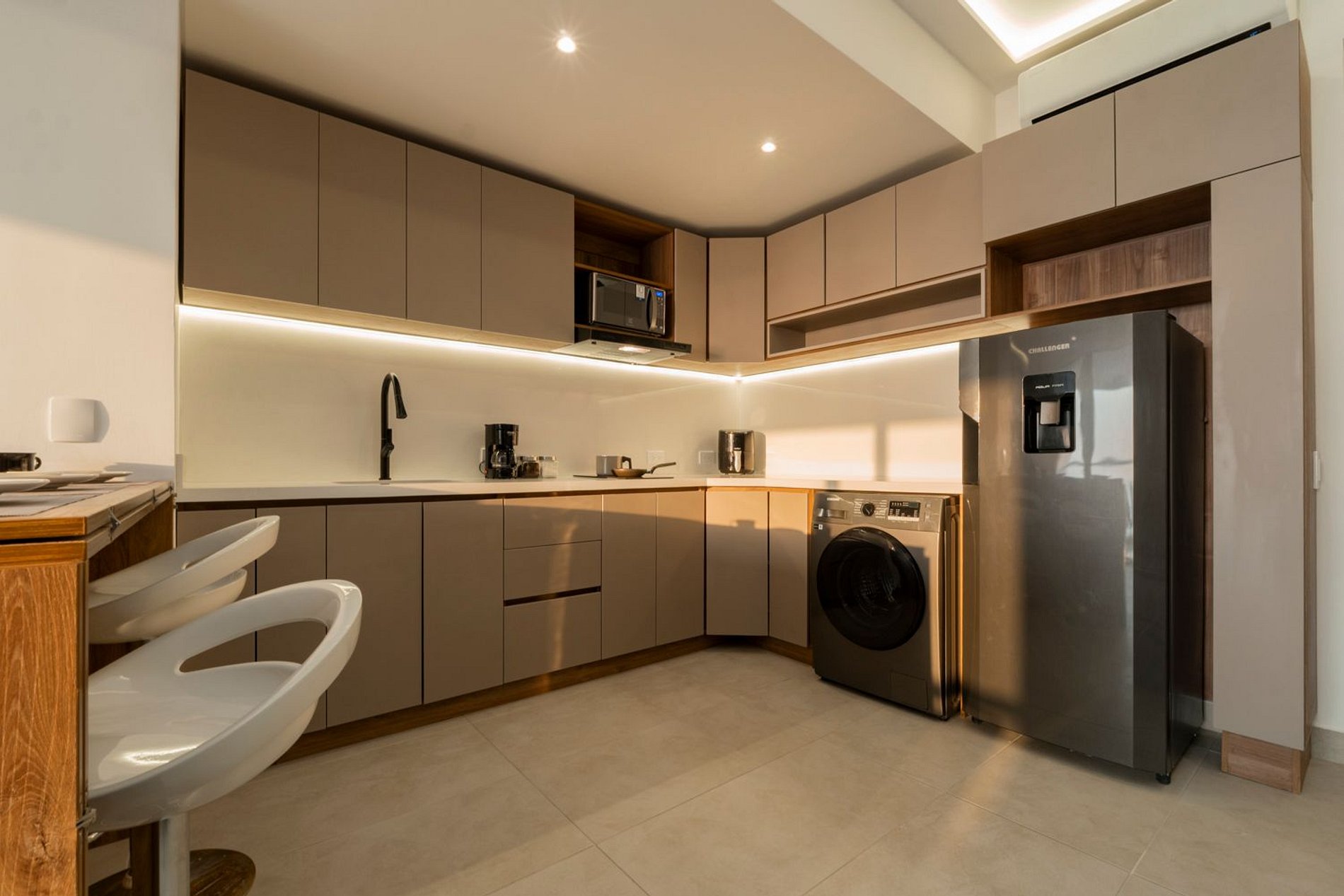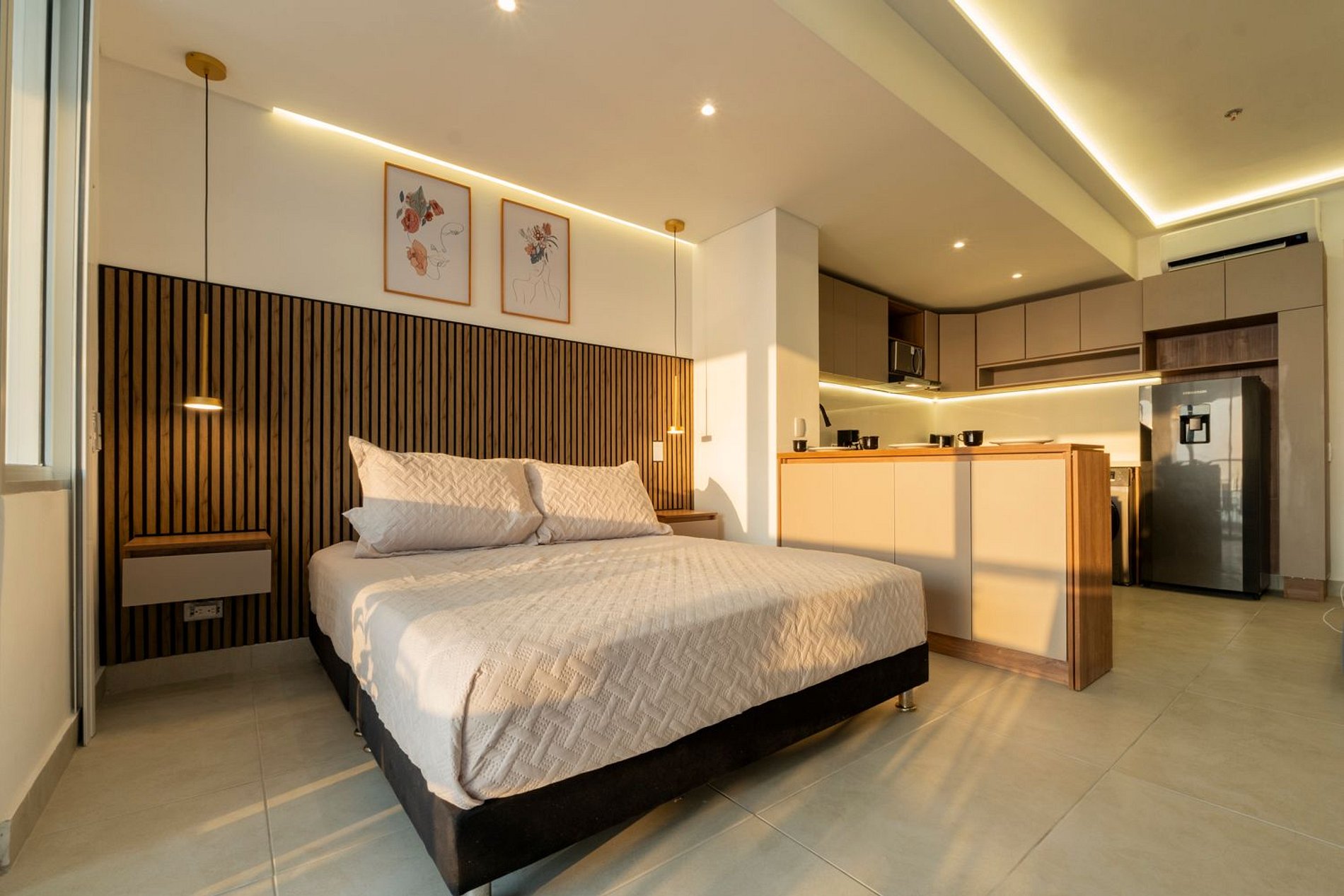 En el piso 9, esta maravillosa suite frente al mar combina diseño moderno y toques cálidos en madera. Disfruta de cama Queen, Smart TV, blackout y aire acondicionado. Relájate en el amplio balcón con mobiliario lounge y vistas únicas al atardecer. Cocina equipada con nevera, microondas, cafetera, menaje completo y lavadora/secadora. Baño elegante en mármol con ducha tipo spa. El edificio ofrece piscina, jacuzzi, sauna, turco, gimnasio y recepción 24/7 junto a la playa. A 2 min del aeropuerto