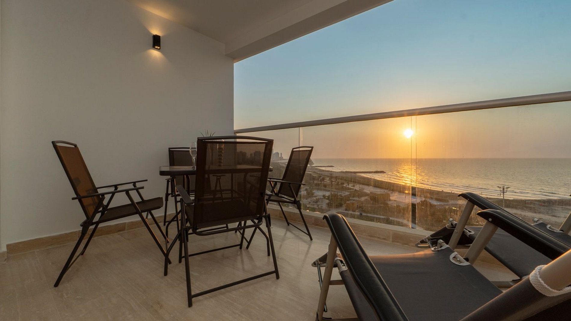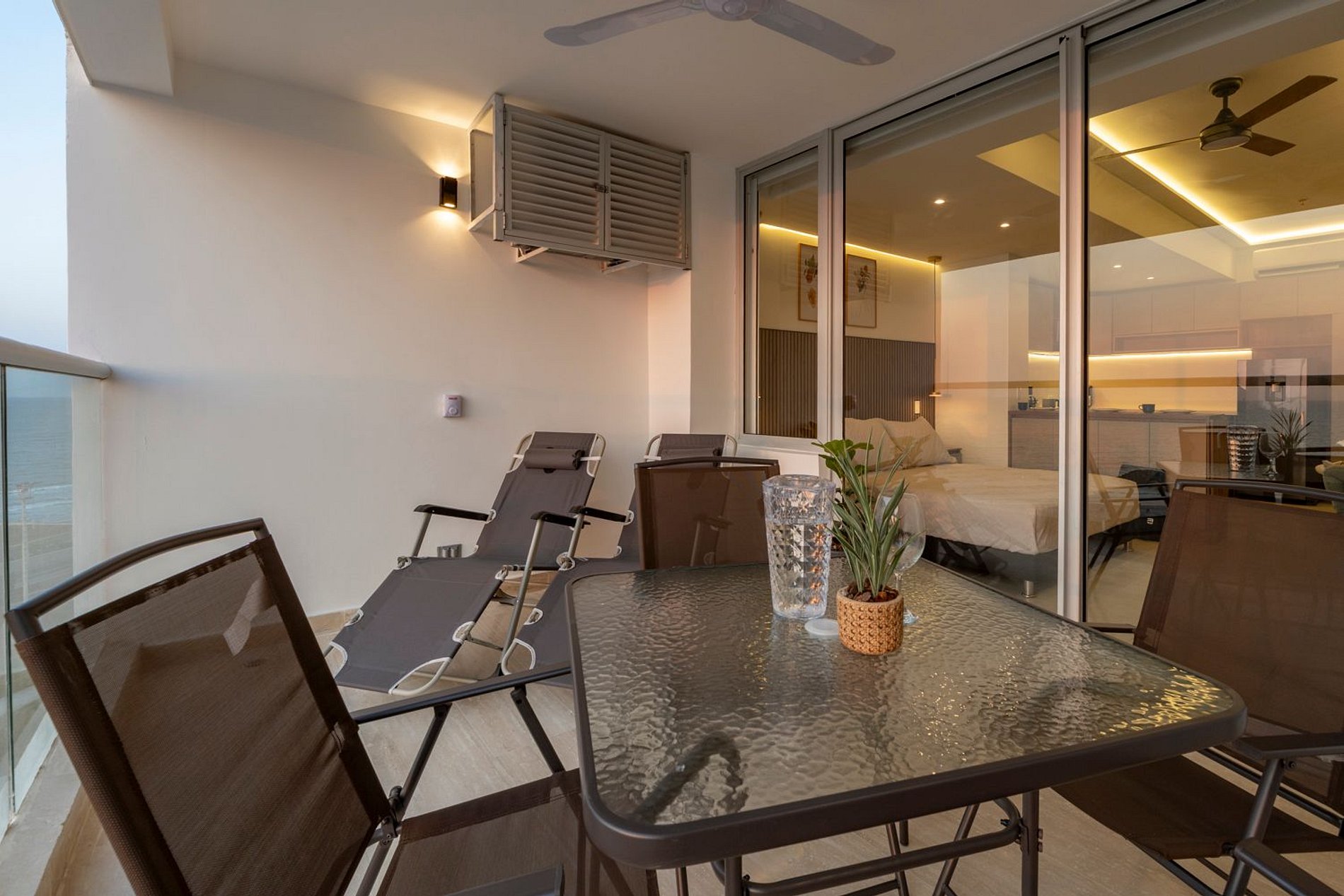 • Balcón amoblado con mesa y sillas, perfecto para contemplar el mar y los atardeceres.