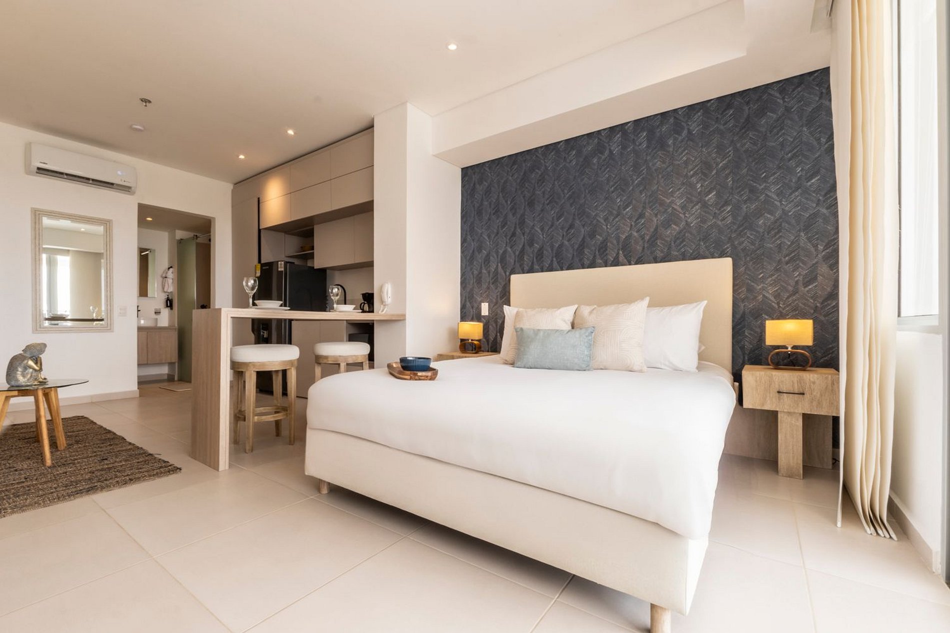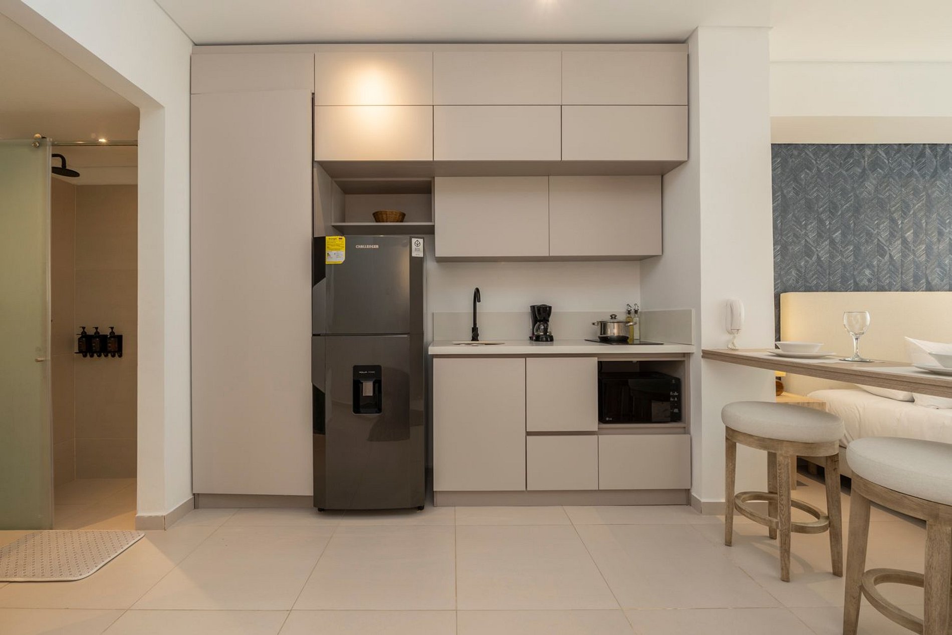 Suite moderna y elegante con terraza privada y vista a la ciénaga, aeropuerto y ciudad. Ideal para parejas que buscan un espacio romántico y acogedor, con cama Queen, cocina equipada y balcón lounge perfecto para relajarse.
