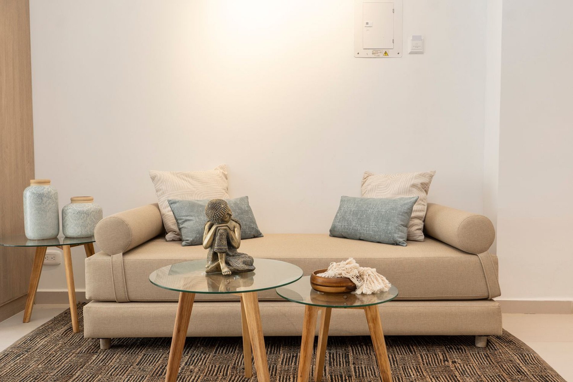 • Sala acogedora con sofá, mesa auxiliar y decoración moderna