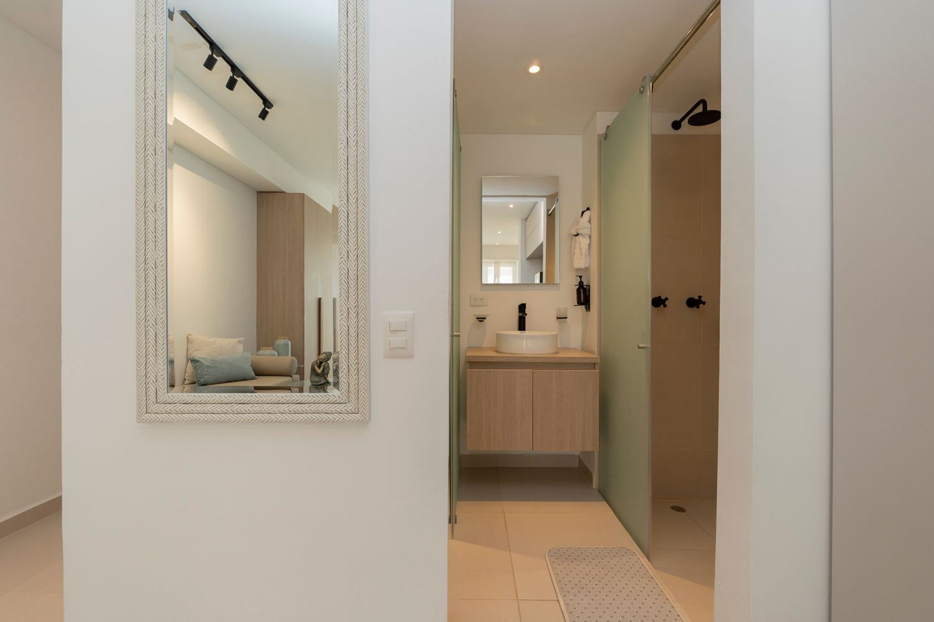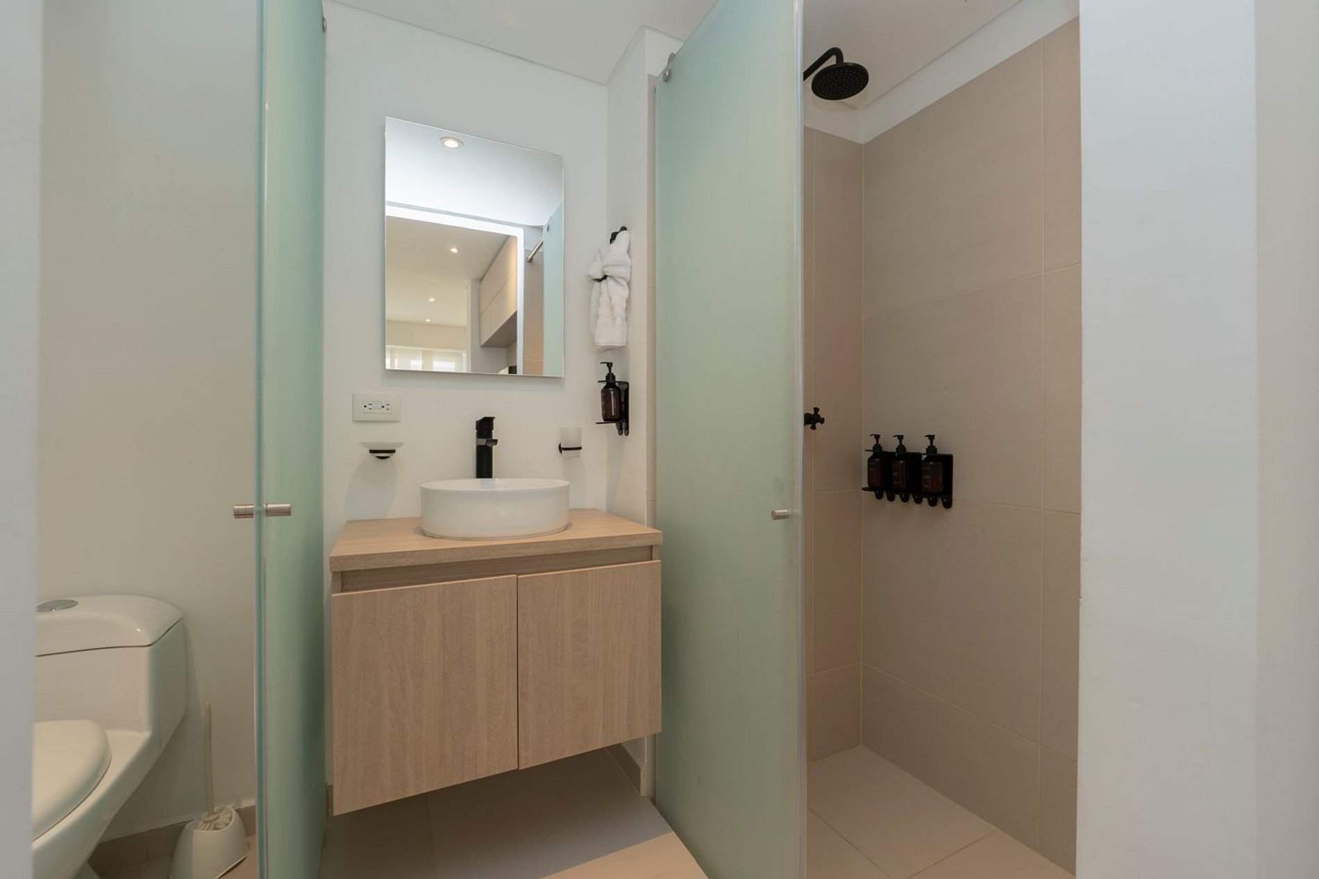 • Baño completo con ducha en vidrio templado, agua caliente y kit básico de aseo