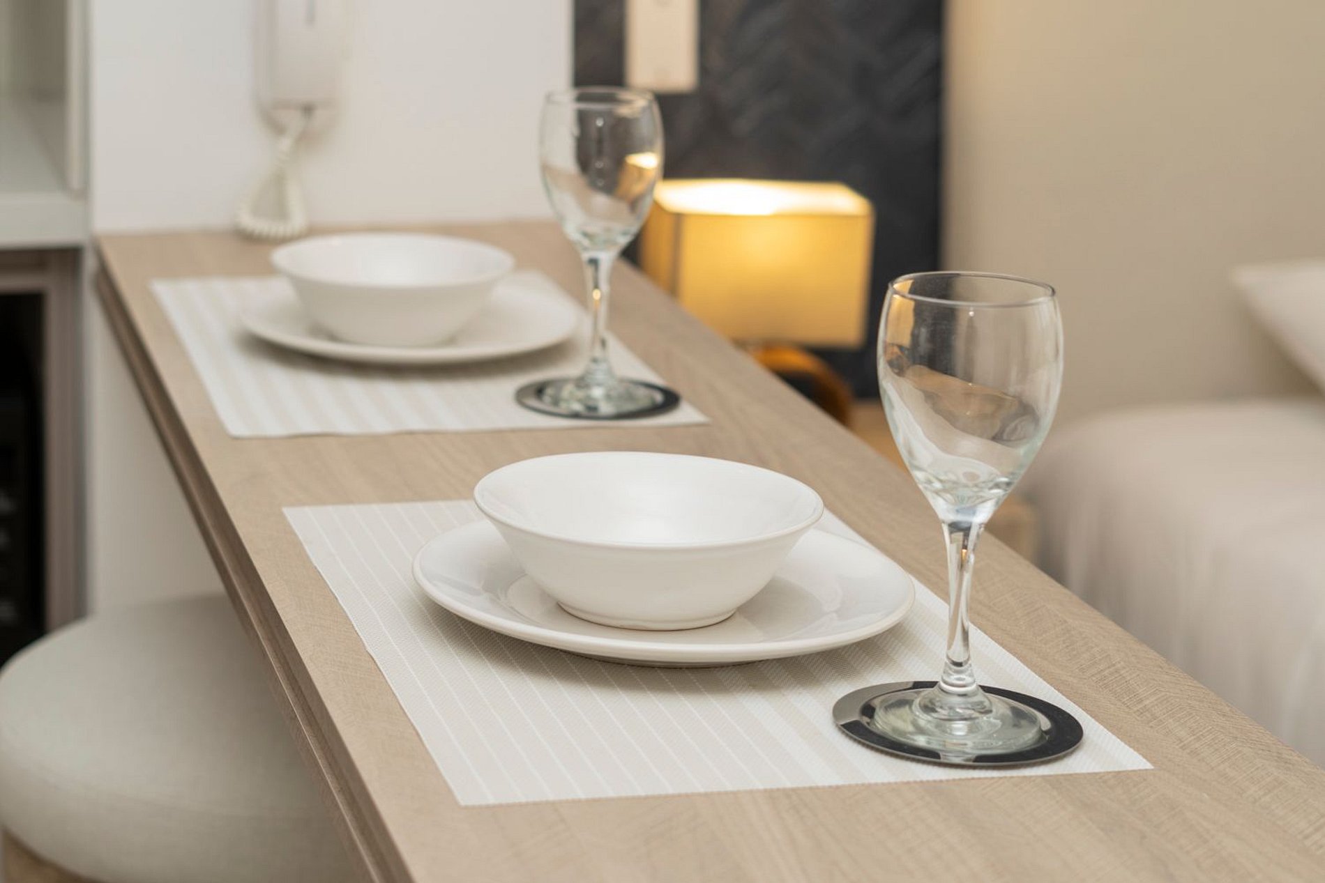 • Cocina full equipada: nevera no-frost, microondas, cafetera, licuadora, estufa de inducción, menaje completo, vajilla y cristalería