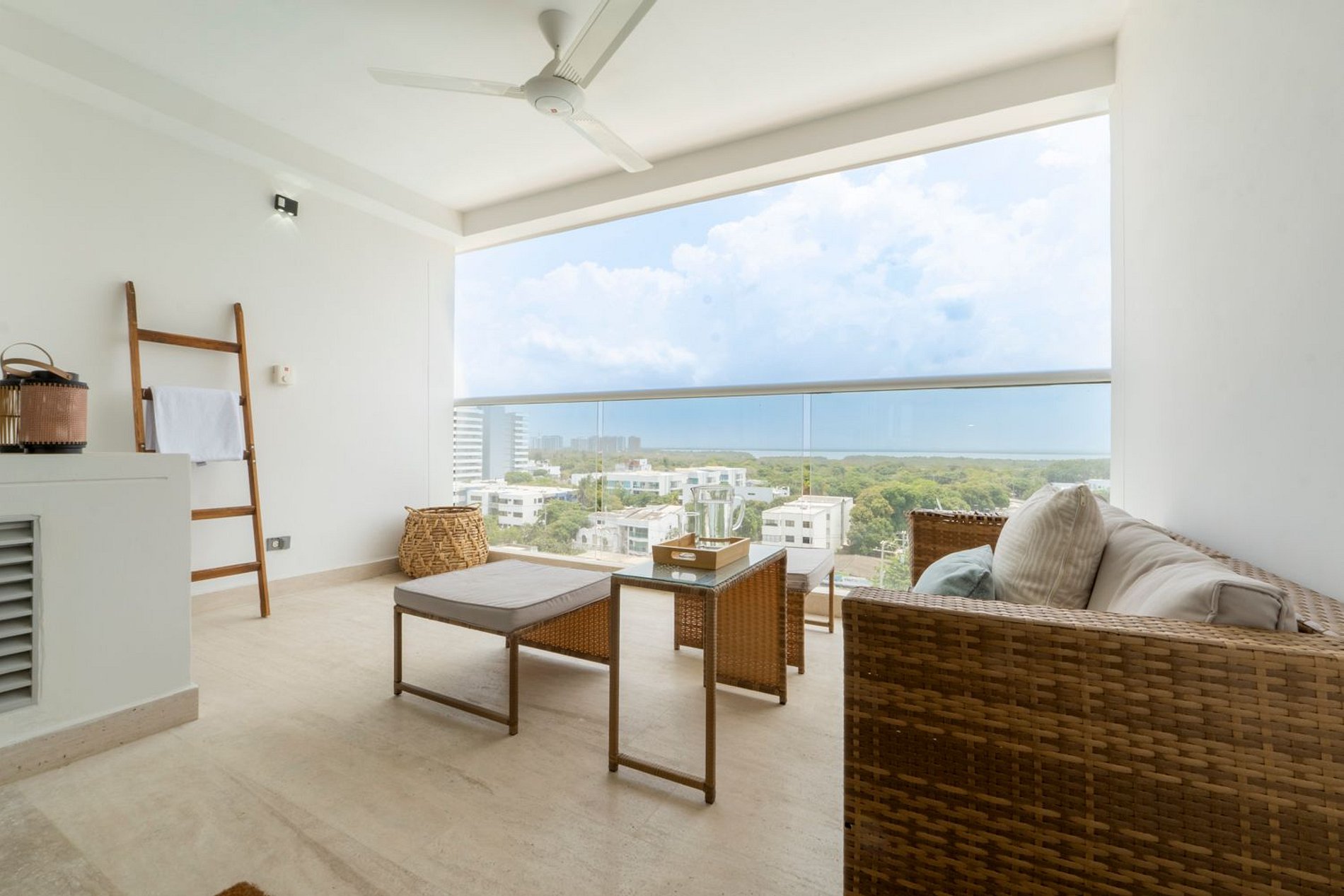 • Terraza privada tipo lounge con mobiliario de exterior, ideal para relajarse con vista a la Ciénaga, aeropuerto y ciudad