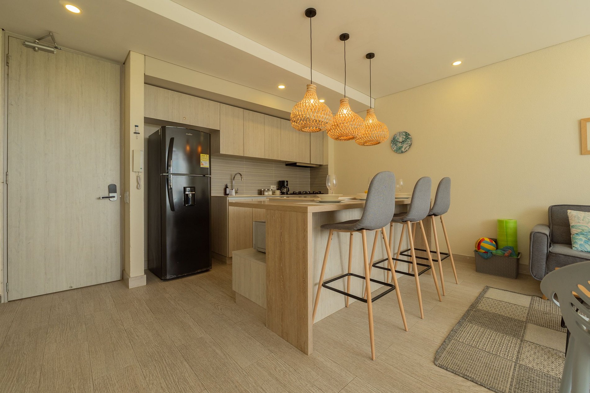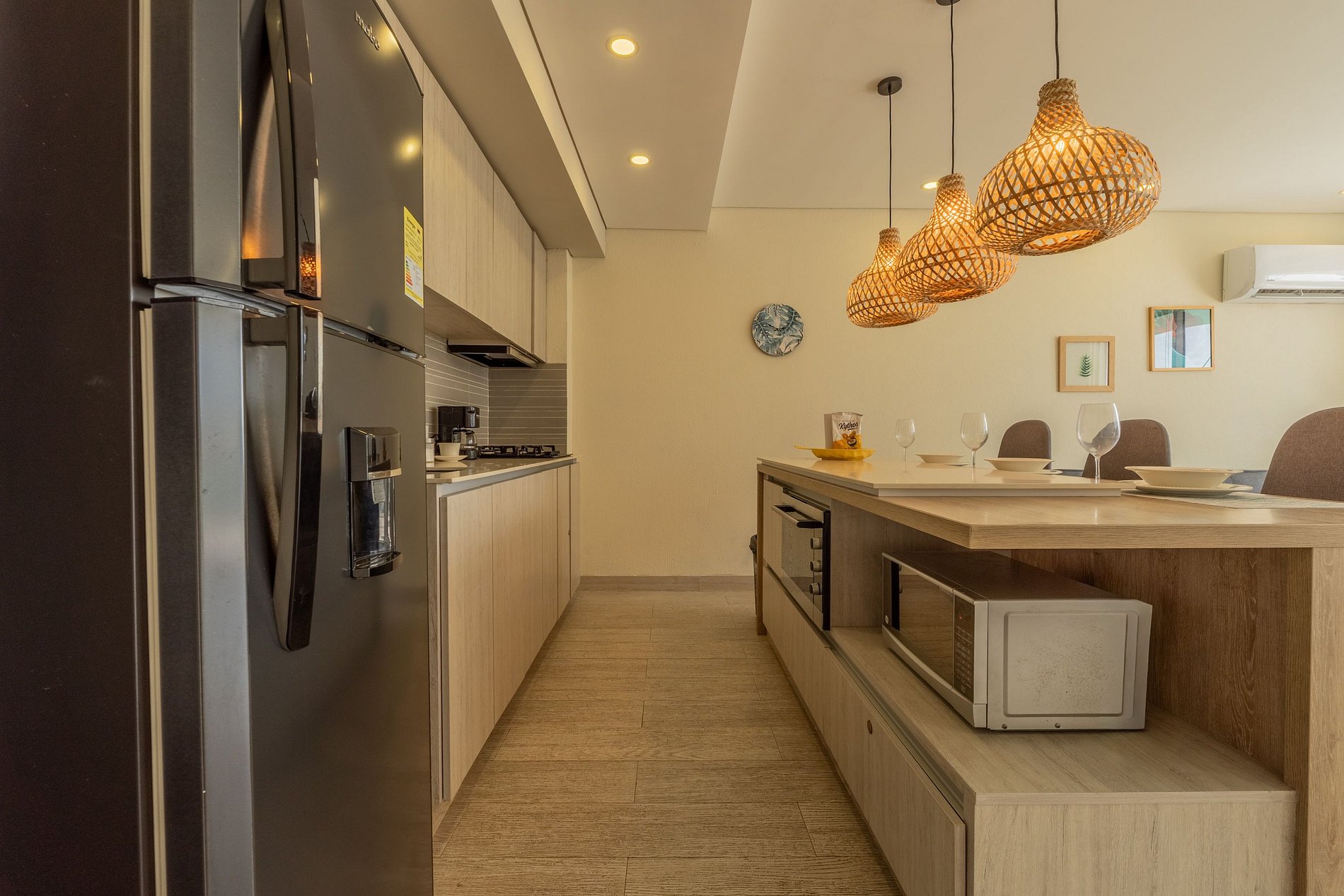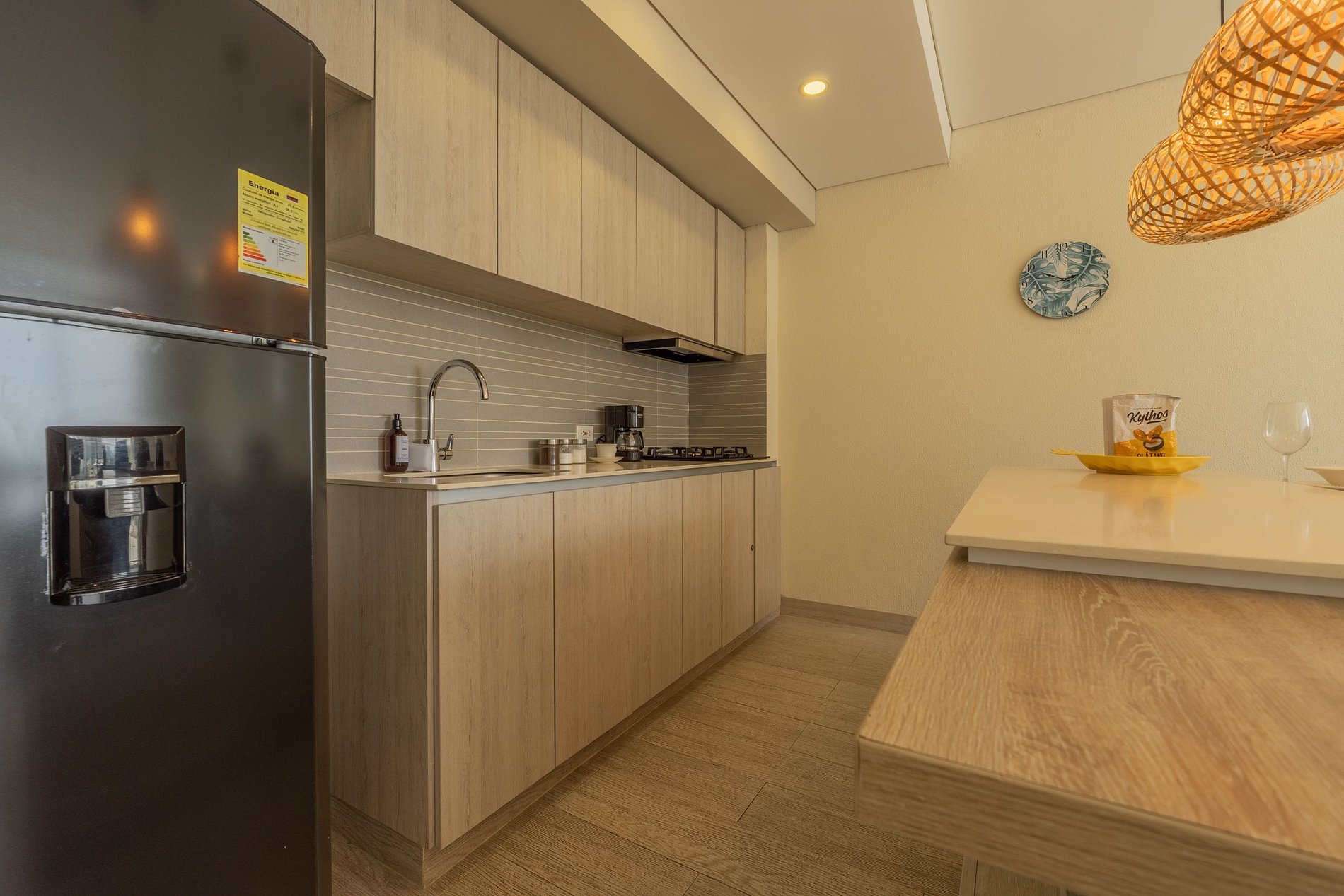 • Cocina totalmente equipada: nevera, estufa a gas, microondas empotrado, crispetera, airfryer, horno tostador, cafetera, licuadora, sandwichera/parrilla, olla arrocera, olla para chocolate, escurridor, vajilla completa y copas