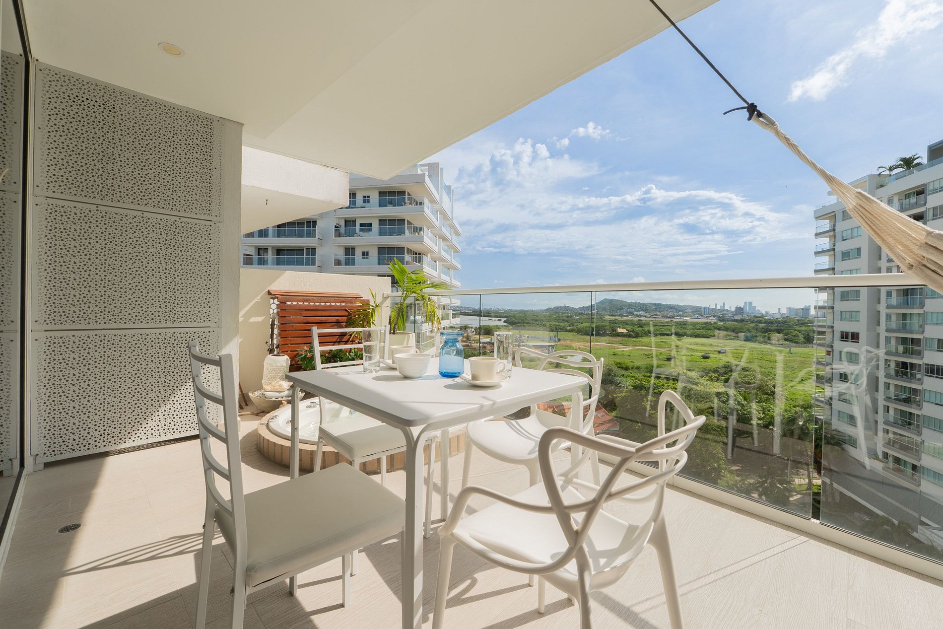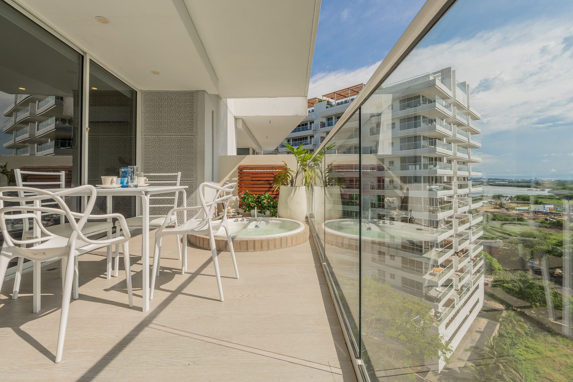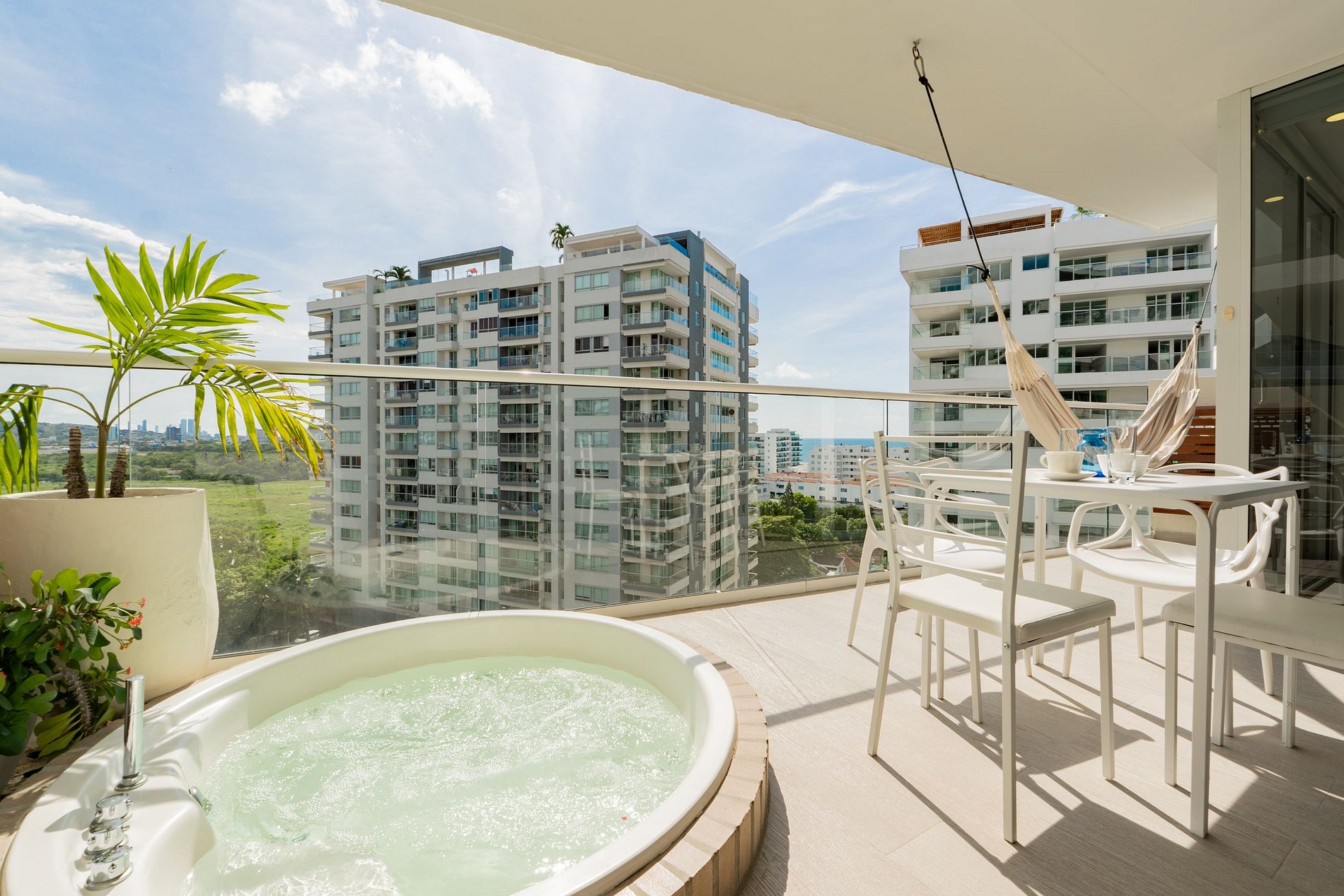 Piso 10 en Martinique: balcón con jacuzzi, hamaca y mesa para 4; vista a la Ciénaga y lateral al mar. Sala amplia con dos sofás; cocina con isla y sillas de barra; cama queen, 2 baños y lavadora–secadora. Estilo boho moderno.