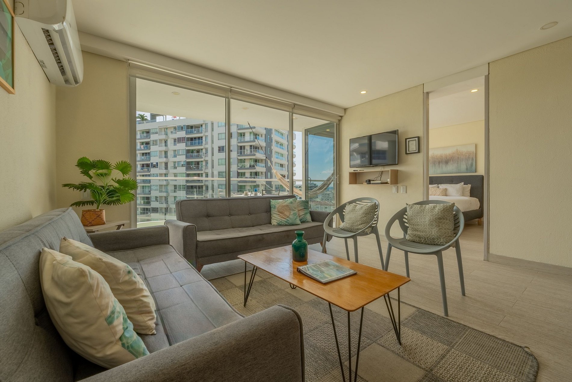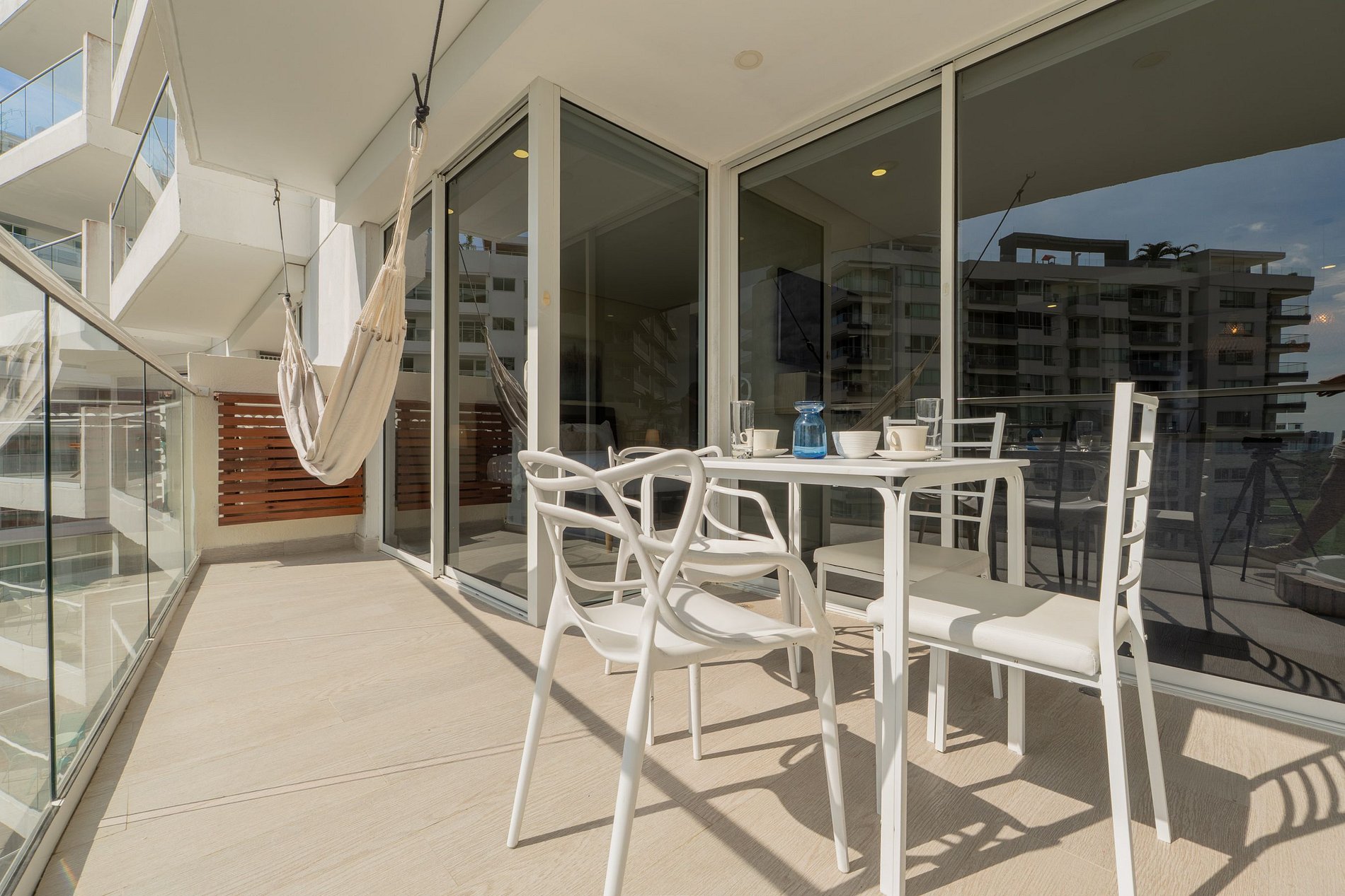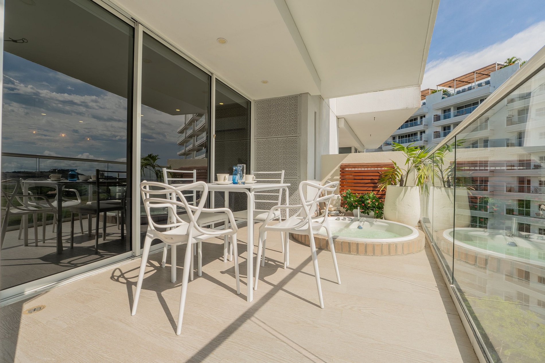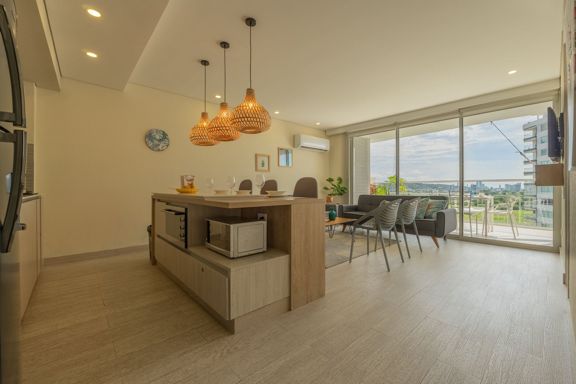 Piso 10 en Martinique: balcón con jacuzzi, hamaca y mesa para 4; vista a la Ciénaga y lateral al mar. Sala amplia con dos sofás; cocina con isla y sillas de barra; cama queen, 2 baños y lavadora–secadora. Estilo boho moderno.
