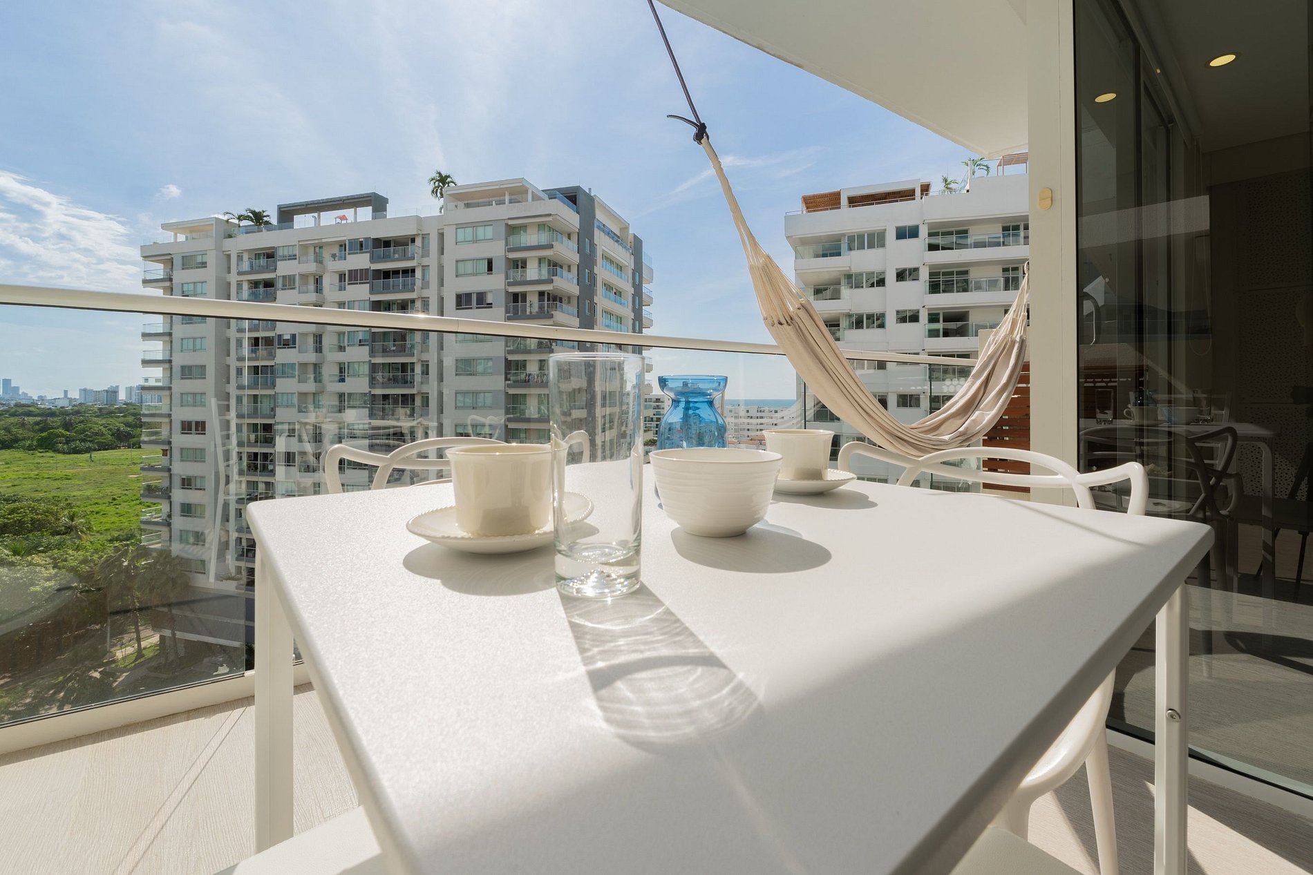 Piso 10 en Martinique: balcón con jacuzzi, hamaca y mesa para 4; vista a la Ciénaga y lateral al mar. Sala amplia con dos sofás; cocina con isla y sillas de barra; cama queen, 2 baños y lavadora–secadora. Estilo boho moderno.
