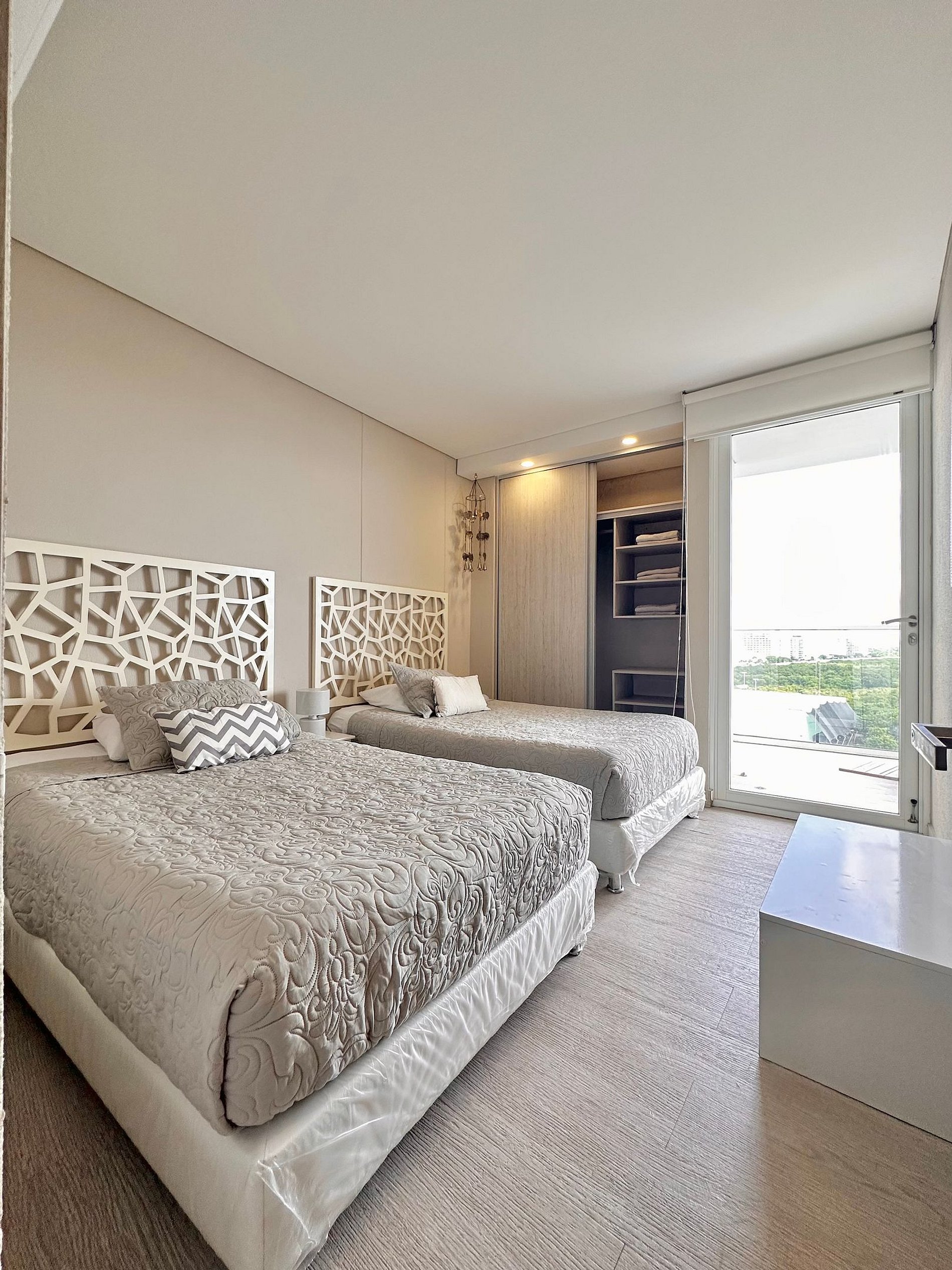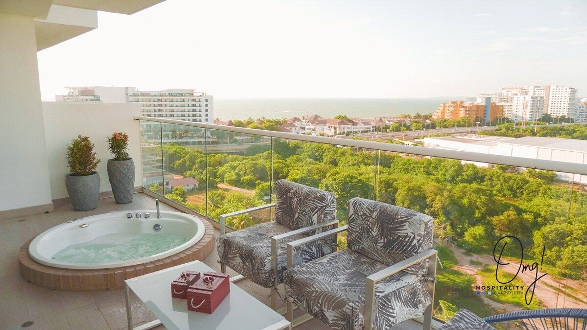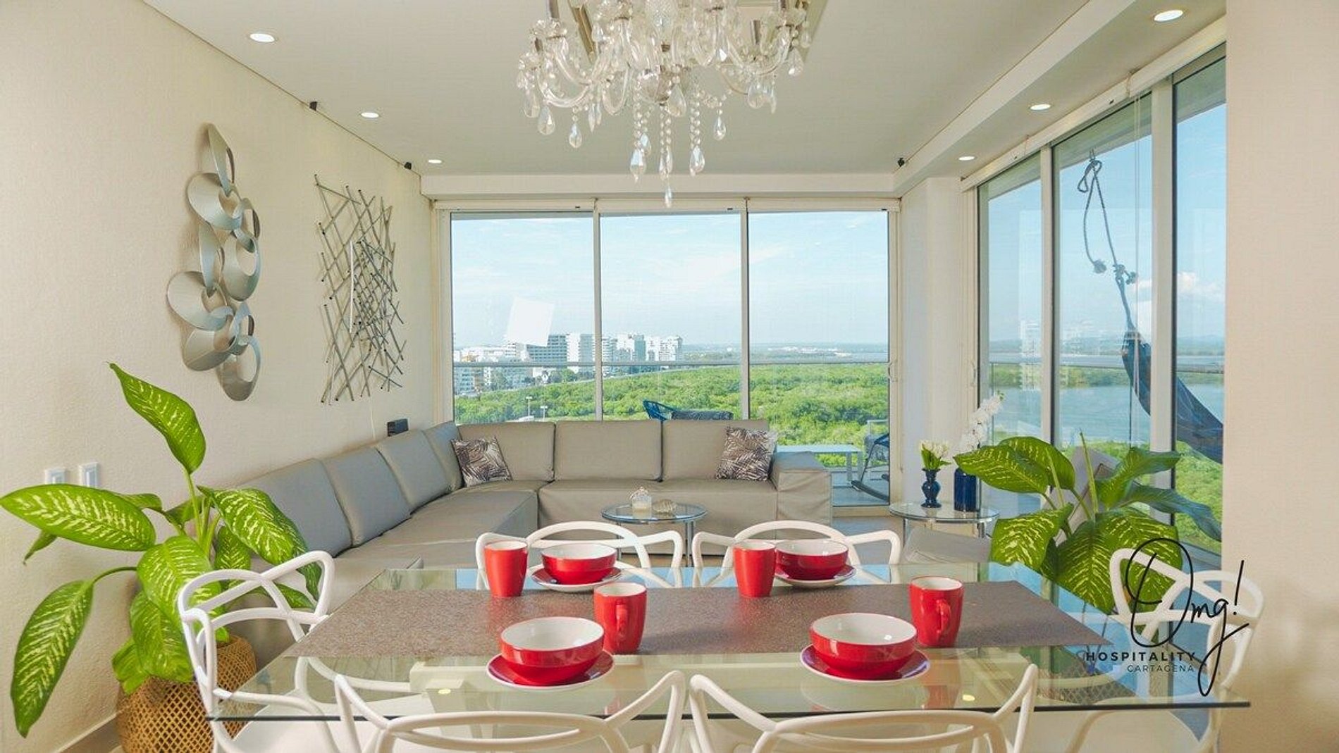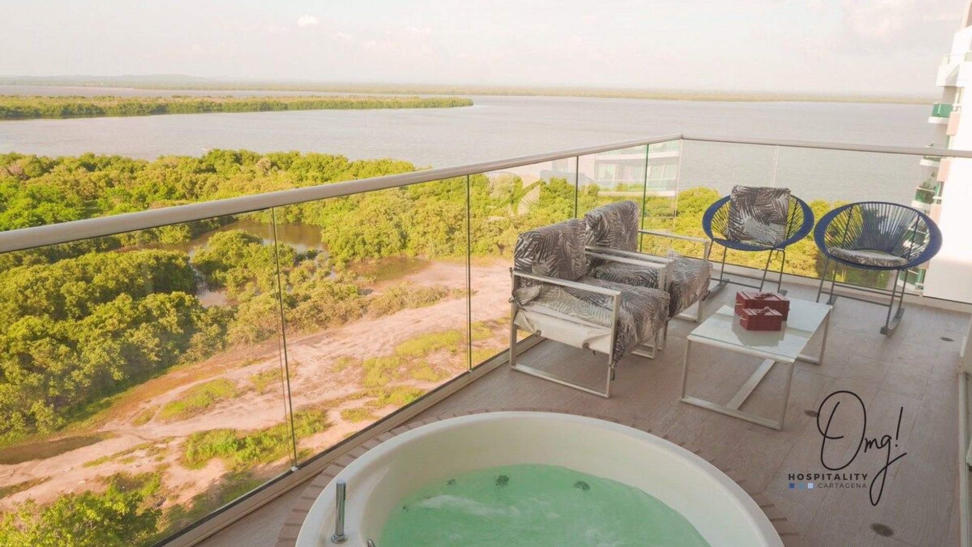 Apartamento en piso 12 con espectacular vista a la Ciénaga de la Virgen desde un amplio balcón en L con jacuzzi privado. Sala luminosa, cocina con isla equipada y lavadora/secadora. 2H/2B: principal con King + auxiliar, segunda con 2 semidobles. AC, WiFi y agua caliente en baños y cocina. A solo 2 cuadras de Playa Azul, la más exclusiva de Cartagena. El edificio ofrece rooftop con vista 360°, 2 piscinas, 2 jacuzzis, gimnasio y baño turco. A pocos minutos del aeropuerto y Centro Histórico.