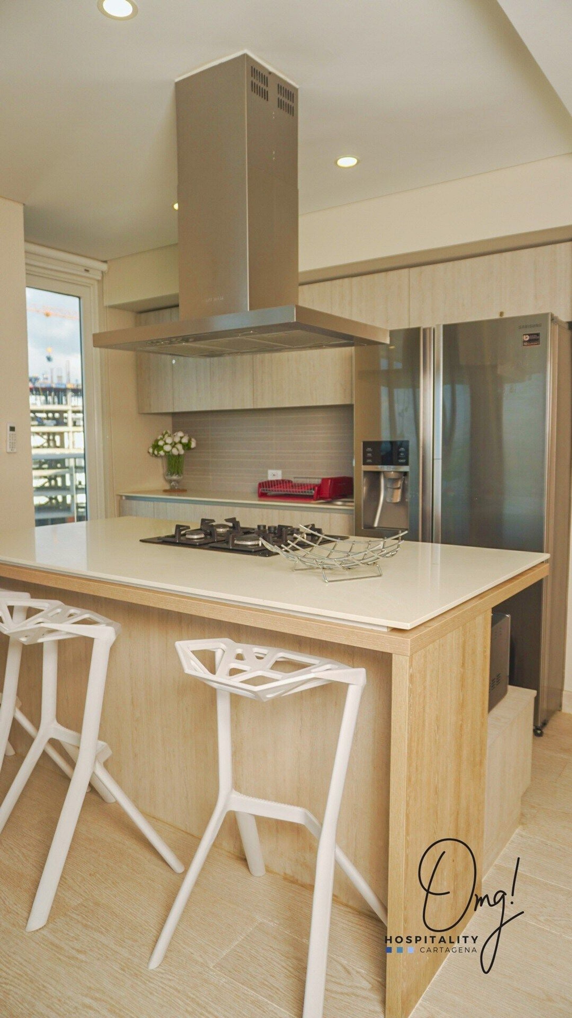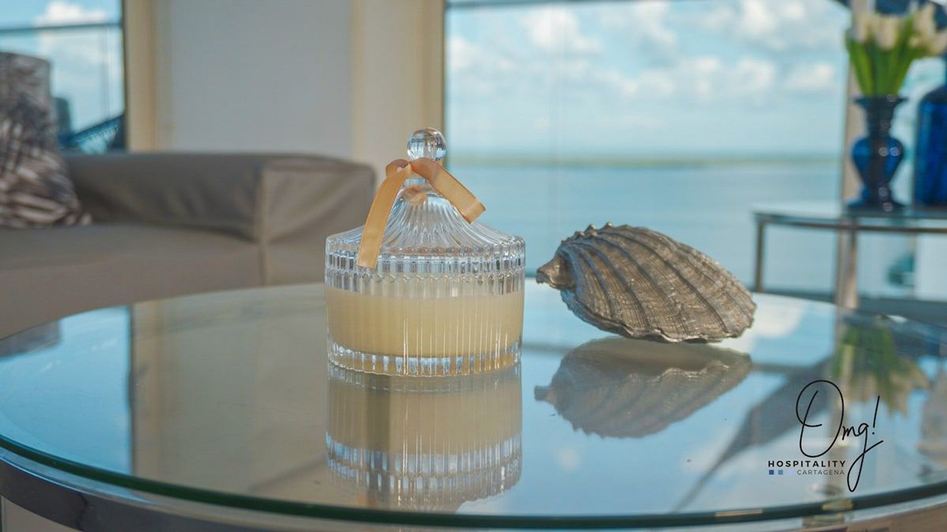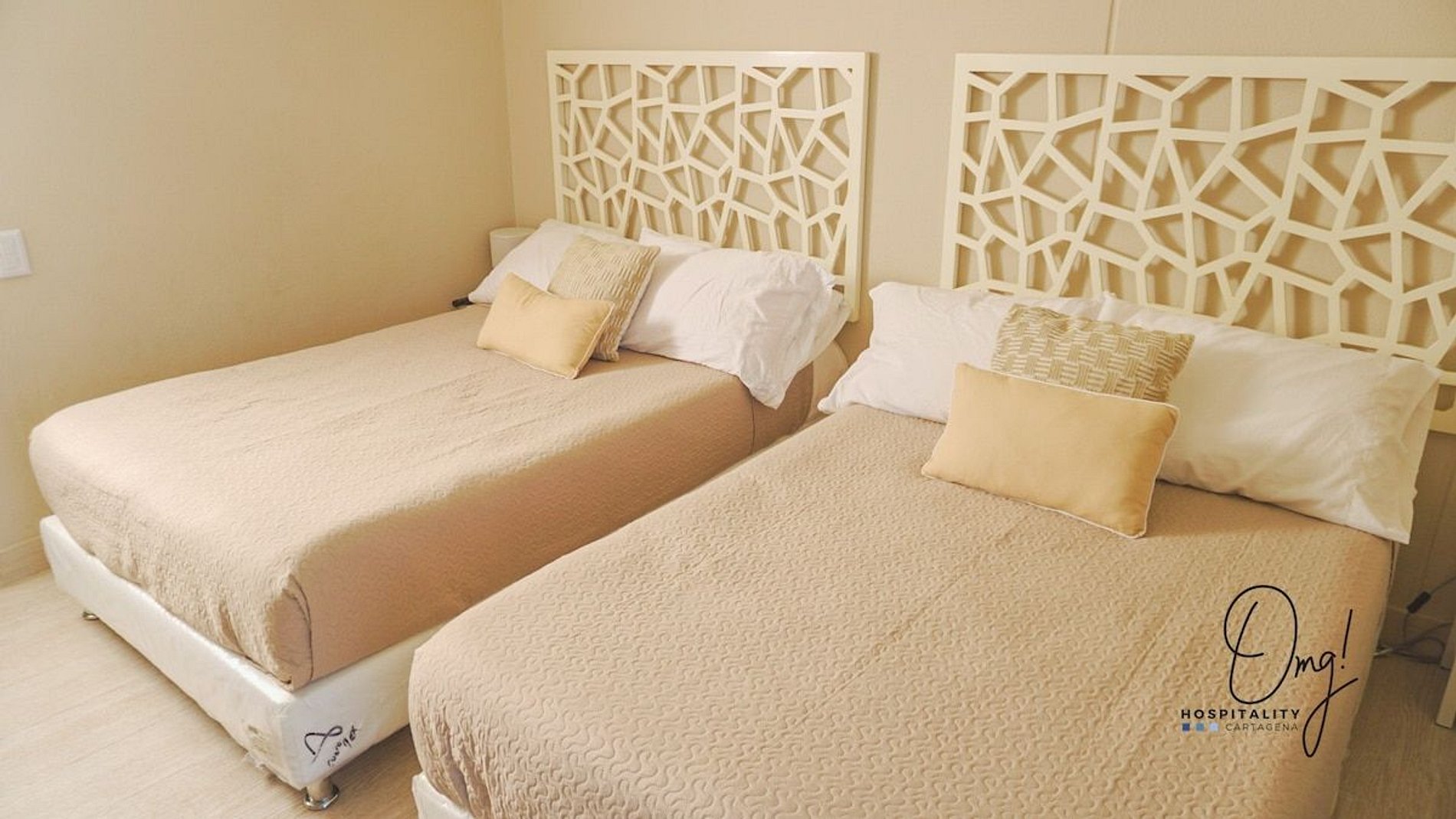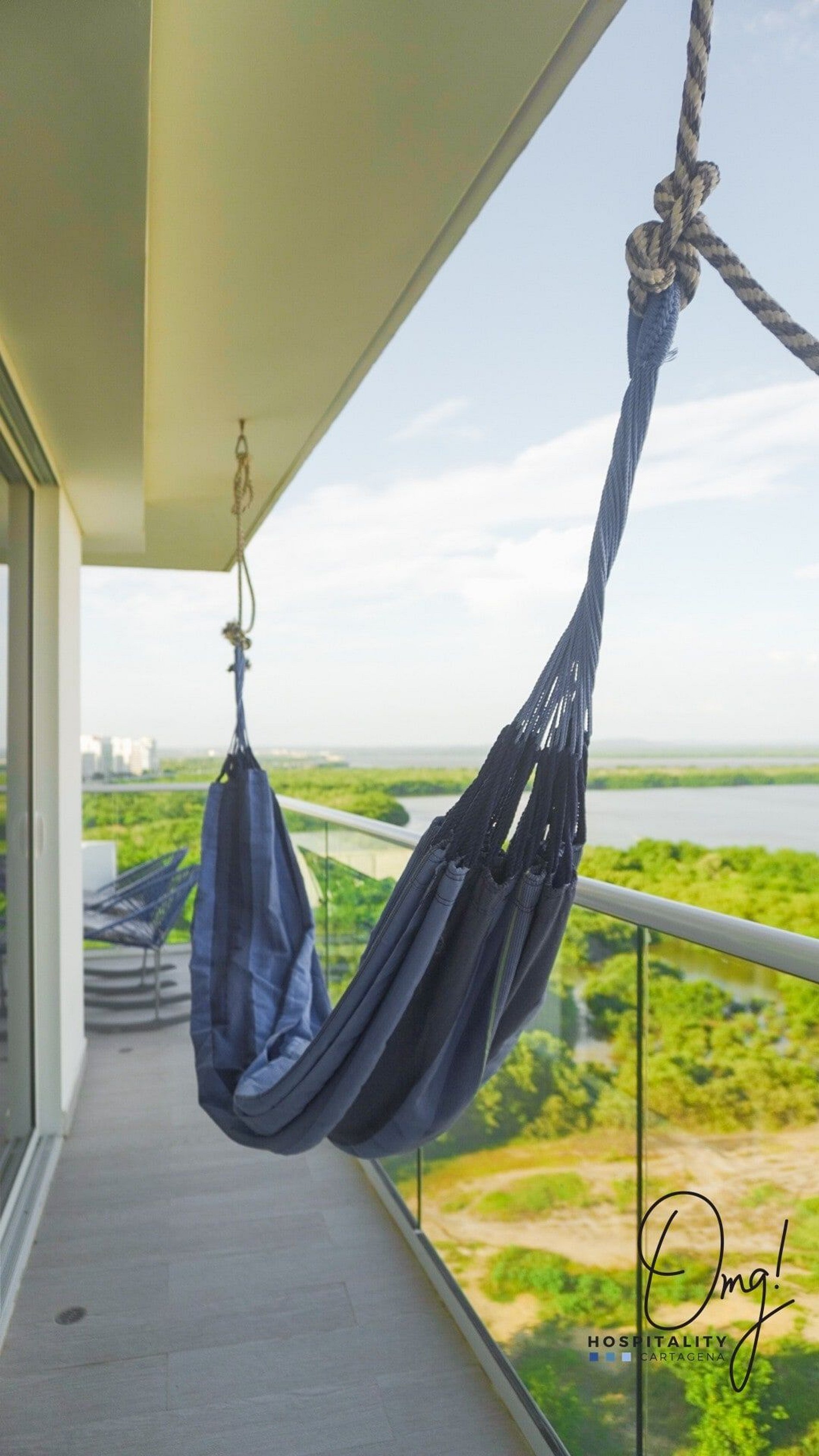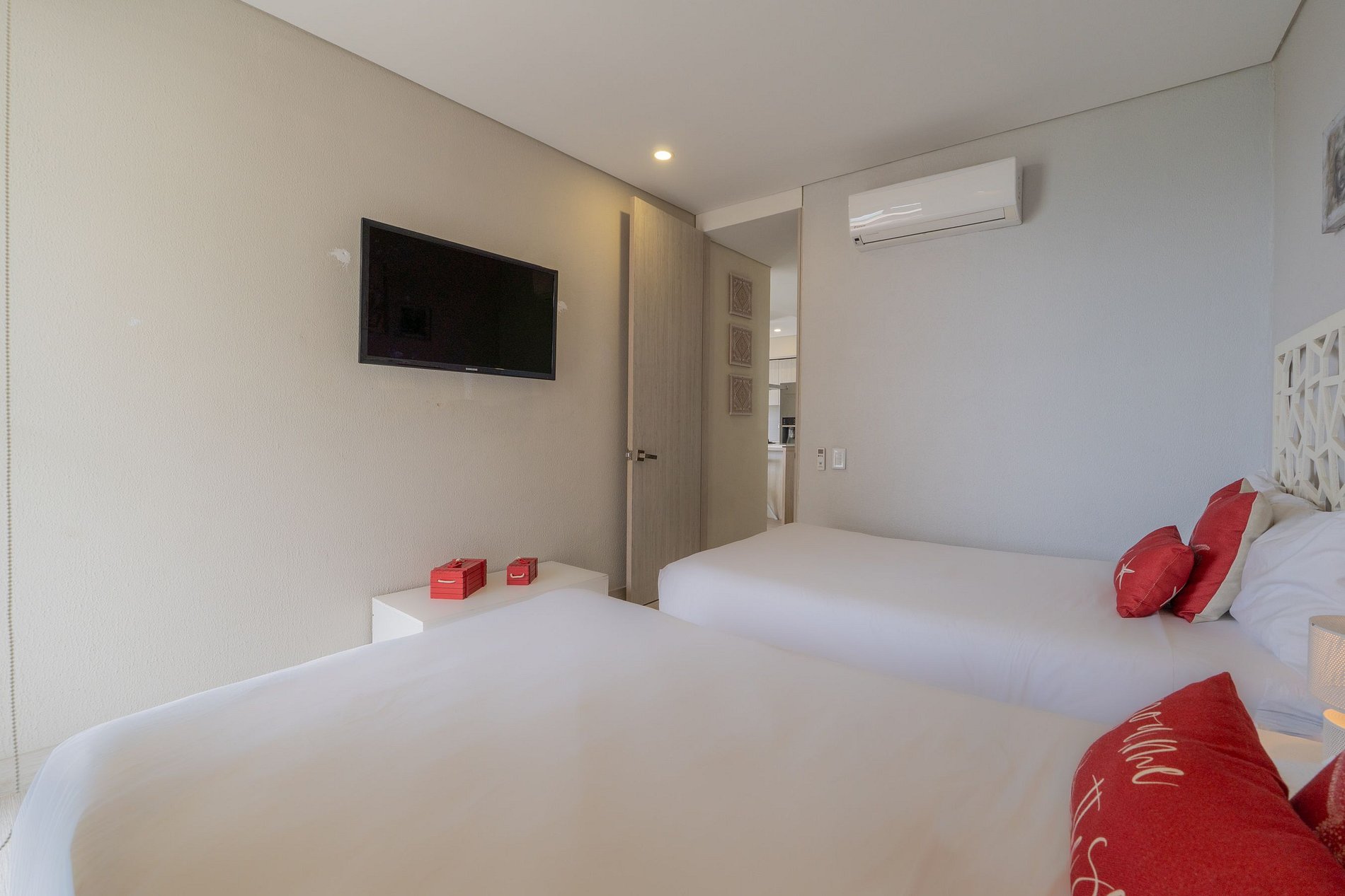 Apartamento en piso 12 con espectacular vista a la Ciénaga de la Virgen desde un amplio balcón en L con jacuzzi privado. Sala luminosa, cocina con isla equipada y lavadora/secadora. 2H/2B: principal con King + auxiliar, segunda con 2 semidobles. AC, WiFi y agua caliente en baños y cocina. A solo 2 cuadras de Playa Azul, la más exclusiva de Cartagena. El edificio ofrece rooftop con vista 360°, 2 piscinas, 2 jacuzzis, gimnasio y baño turco. A pocos minutos del aeropuerto y Centro Histórico.