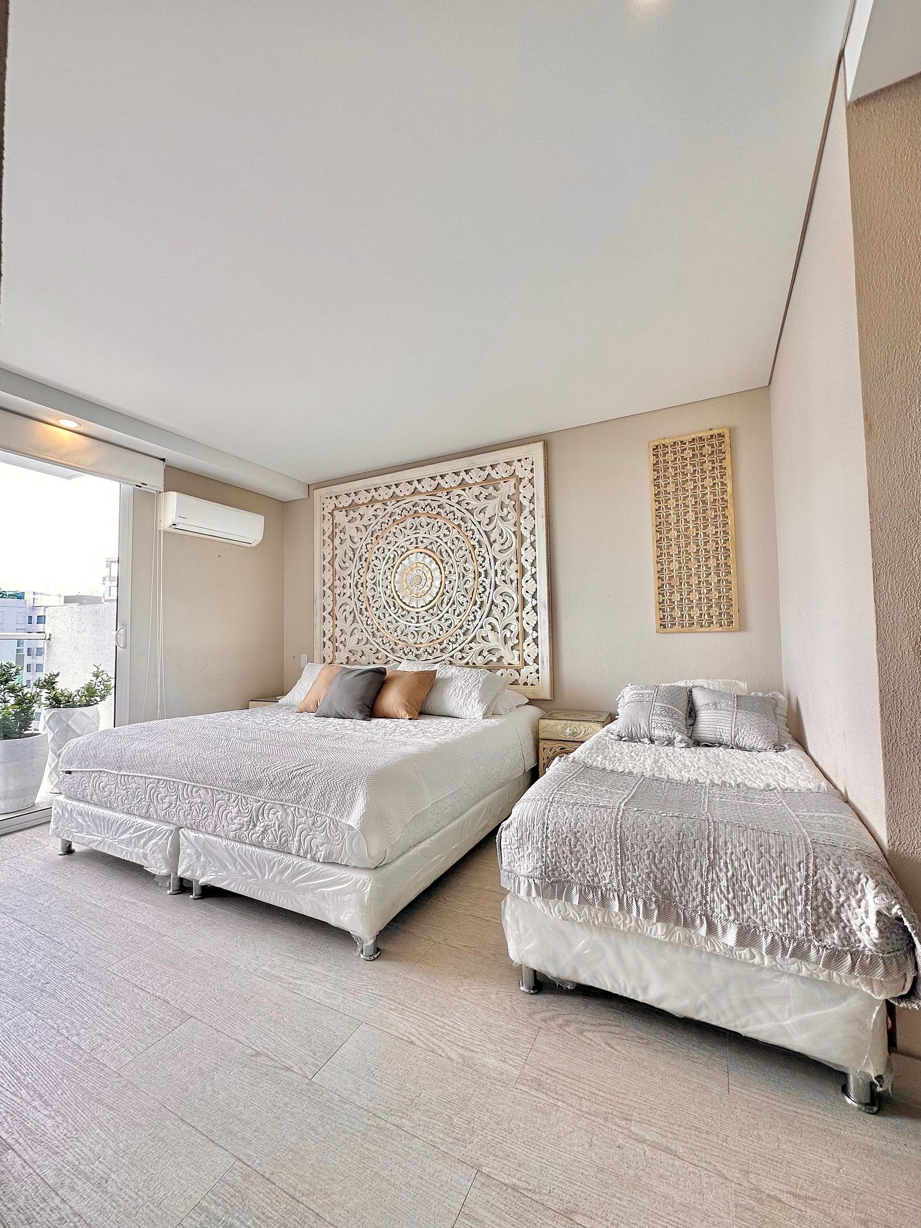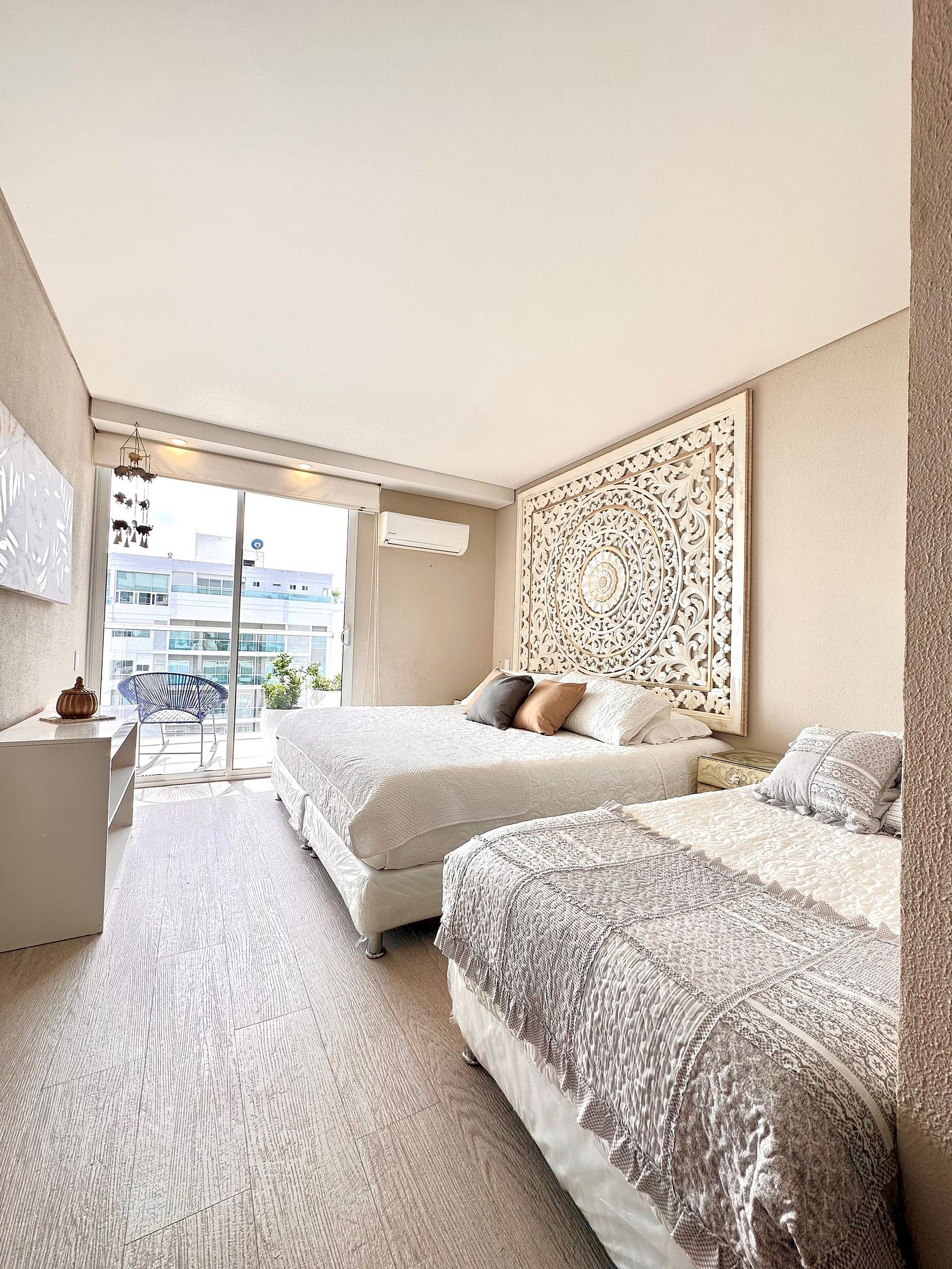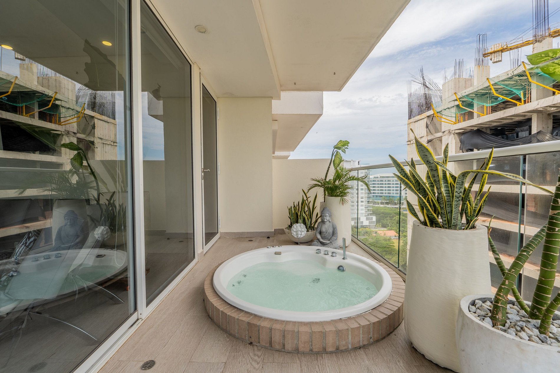 Apartamento esquinero en piso 12 con balcón en L y jacuzzi privado. 2H/2B, cama King + auxiliar, 2 semidobles, cocina con isla y lavadora/secadora.