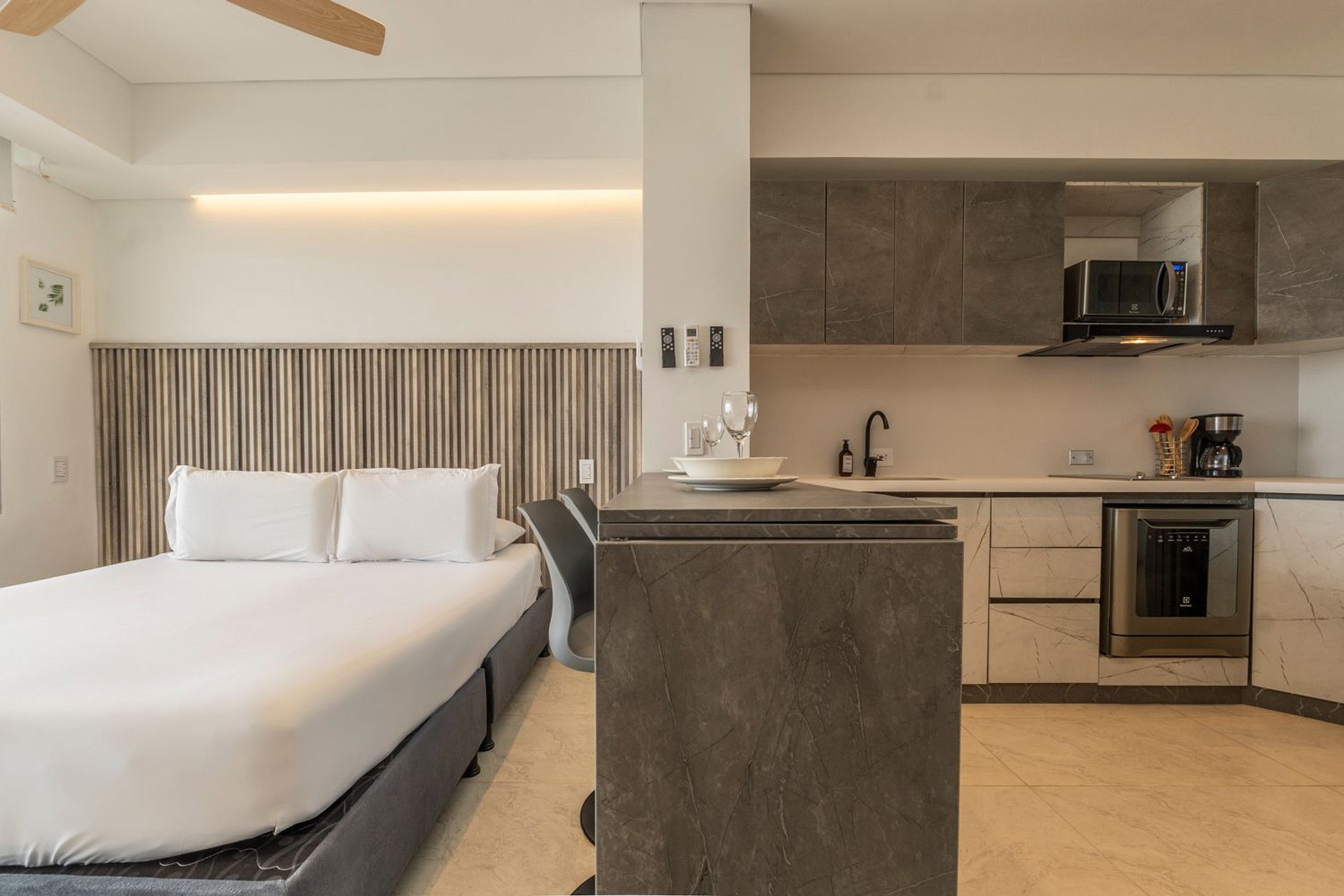 Suite moderna en el piso 6 con cama king, balcón vista al mar, cocina equipada y baño de lujo en mármol. Wi-Fi rápido y acceso a piscina, jacuzzi, sauna y turco frente a la playa.