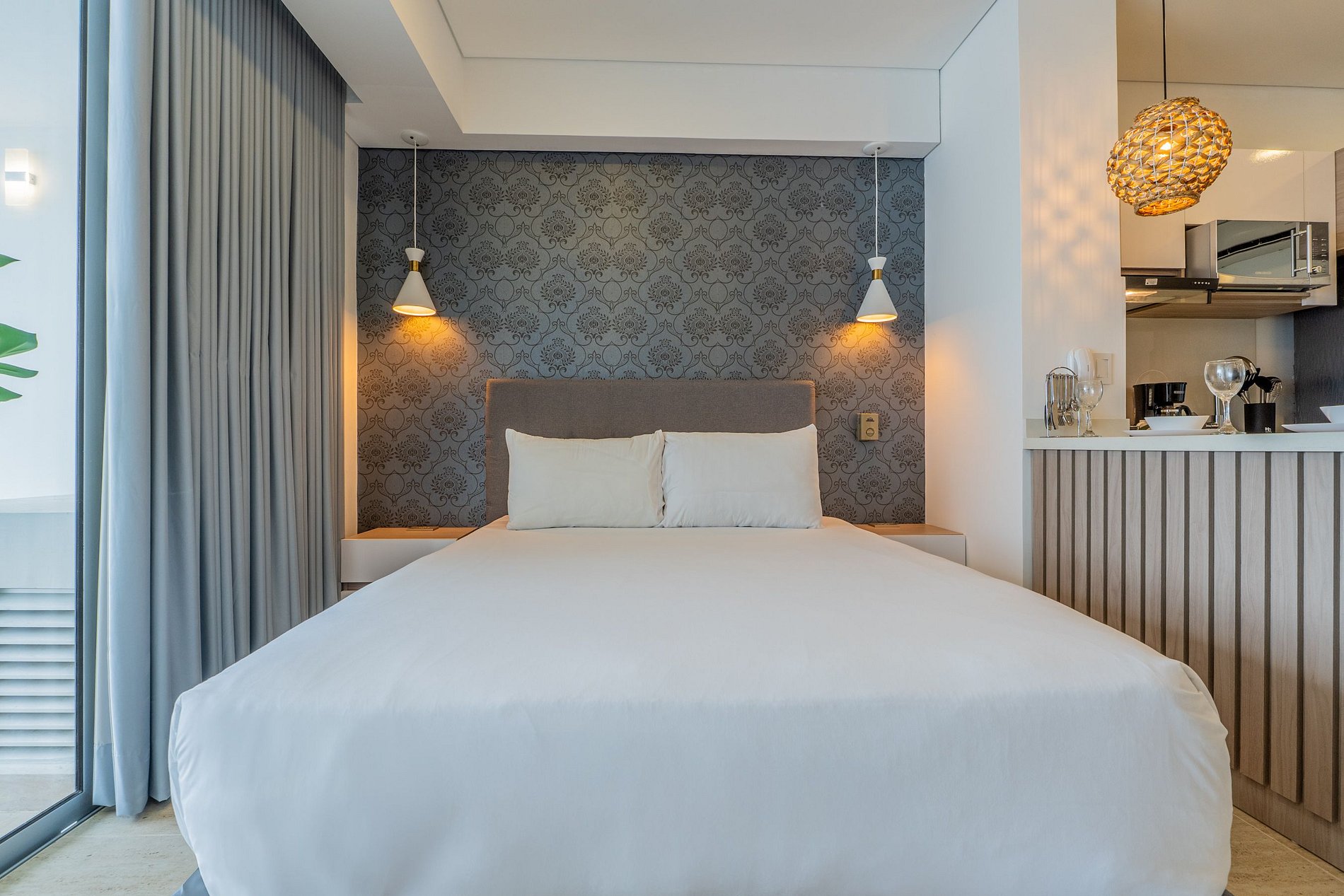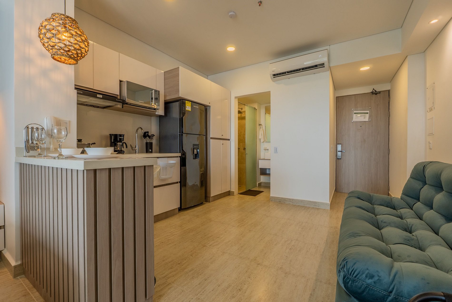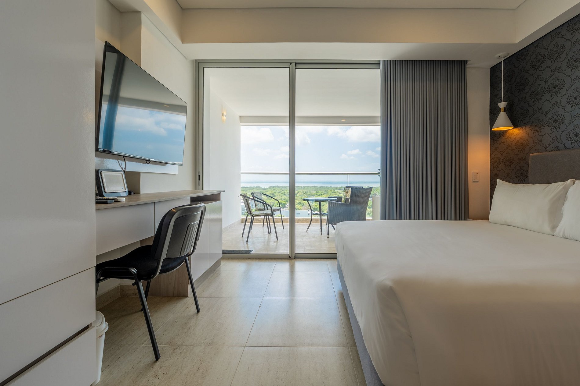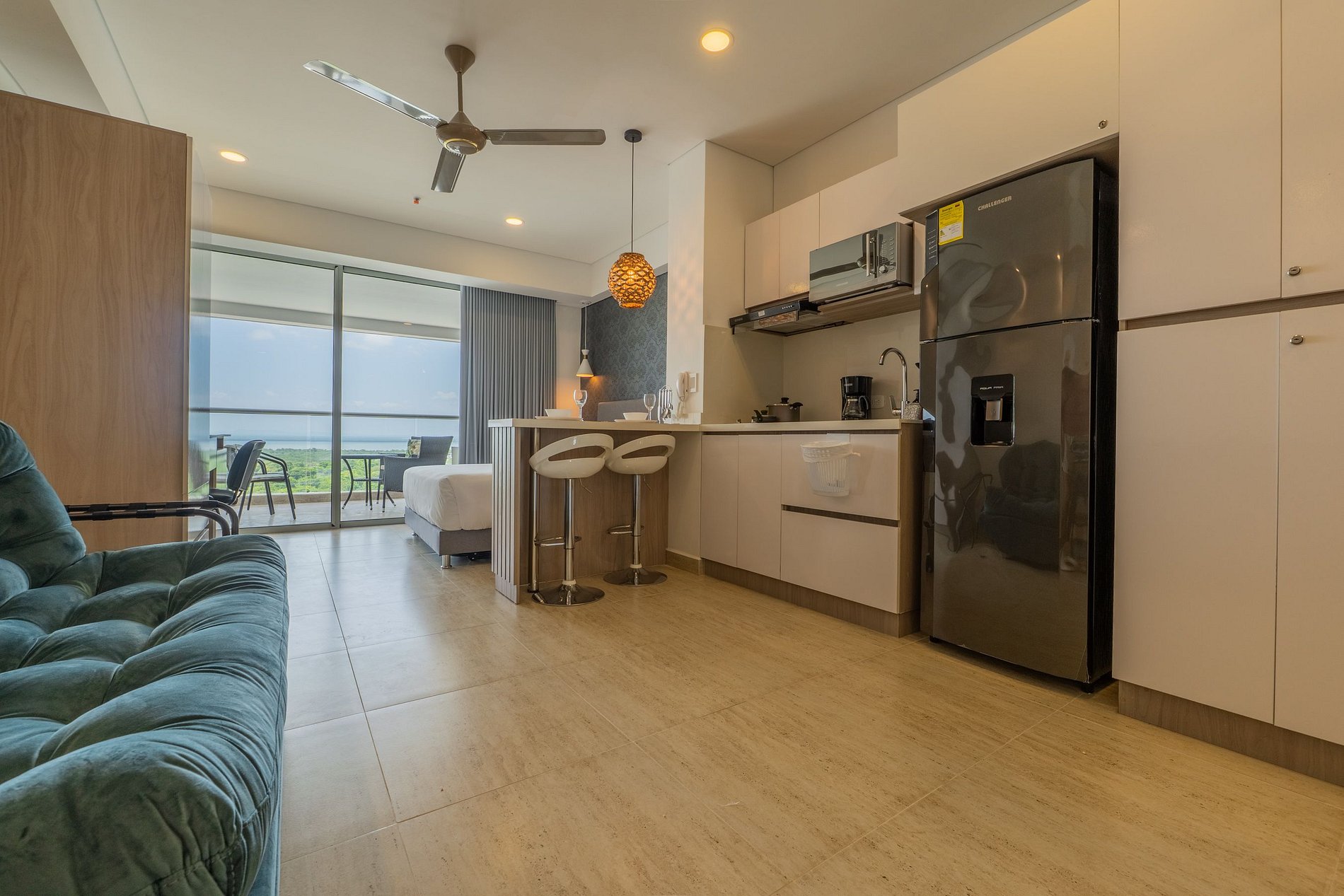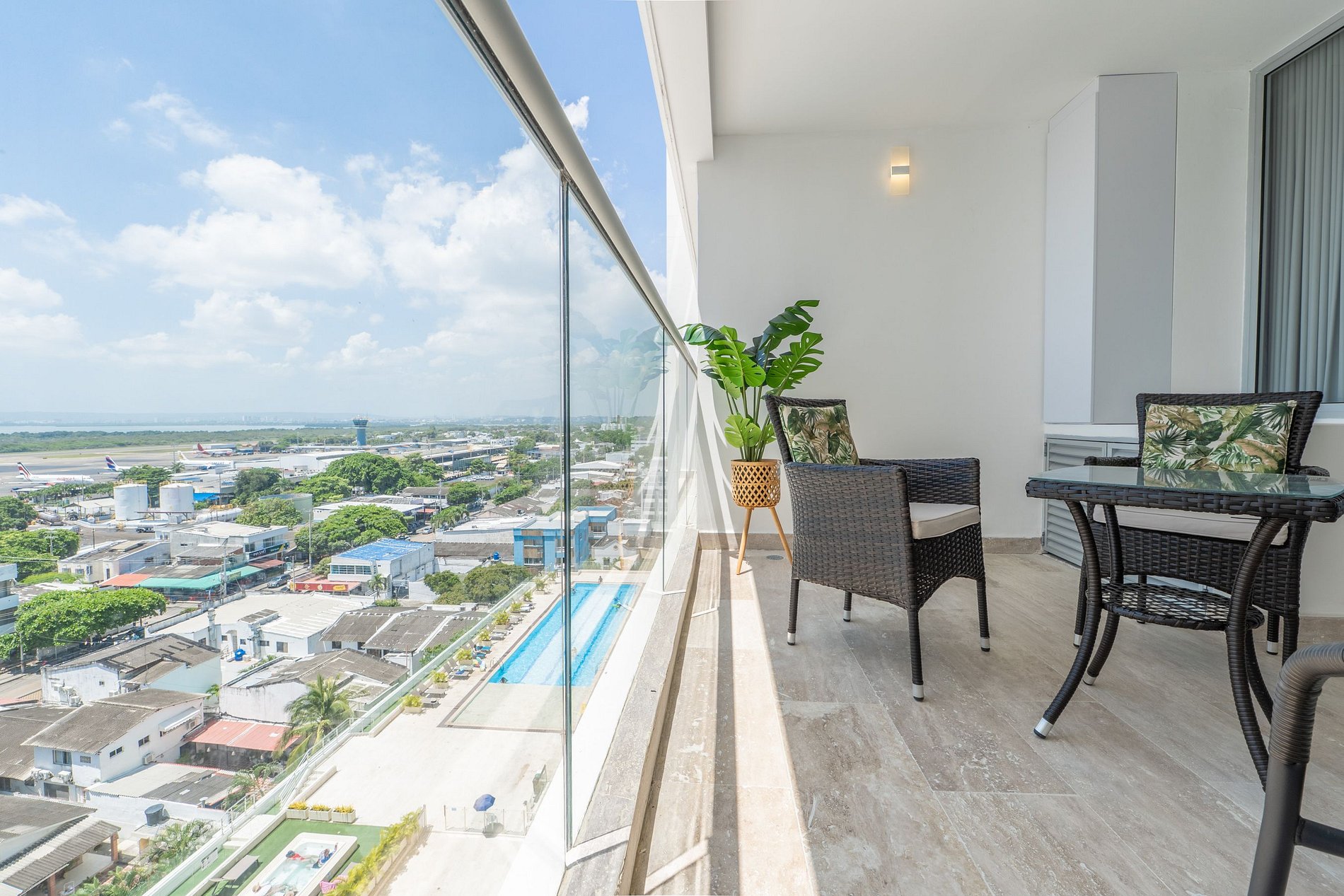 Disfruta esta suite moderna en el piso 10 de Cartagena Beach, con balcón amoblado y vista despejada a la Ciénaga, la ciudad y el mar. Cuenta con cama Queen, sofá cama, Smart TV, aire acondicionado, ventilador y escritorio de trabajo. La cocina está equipada con nevera, microondas, cafetera y menaje. Equipado con Lavadora Secadora. Baño con ducha tipo lluvia y acabados elegantes. El edificio ofrece piscina, jacuzzi, sauna, turco y lobby 24h, a pasos de la playa y parque. 3 min del aeropuerto.