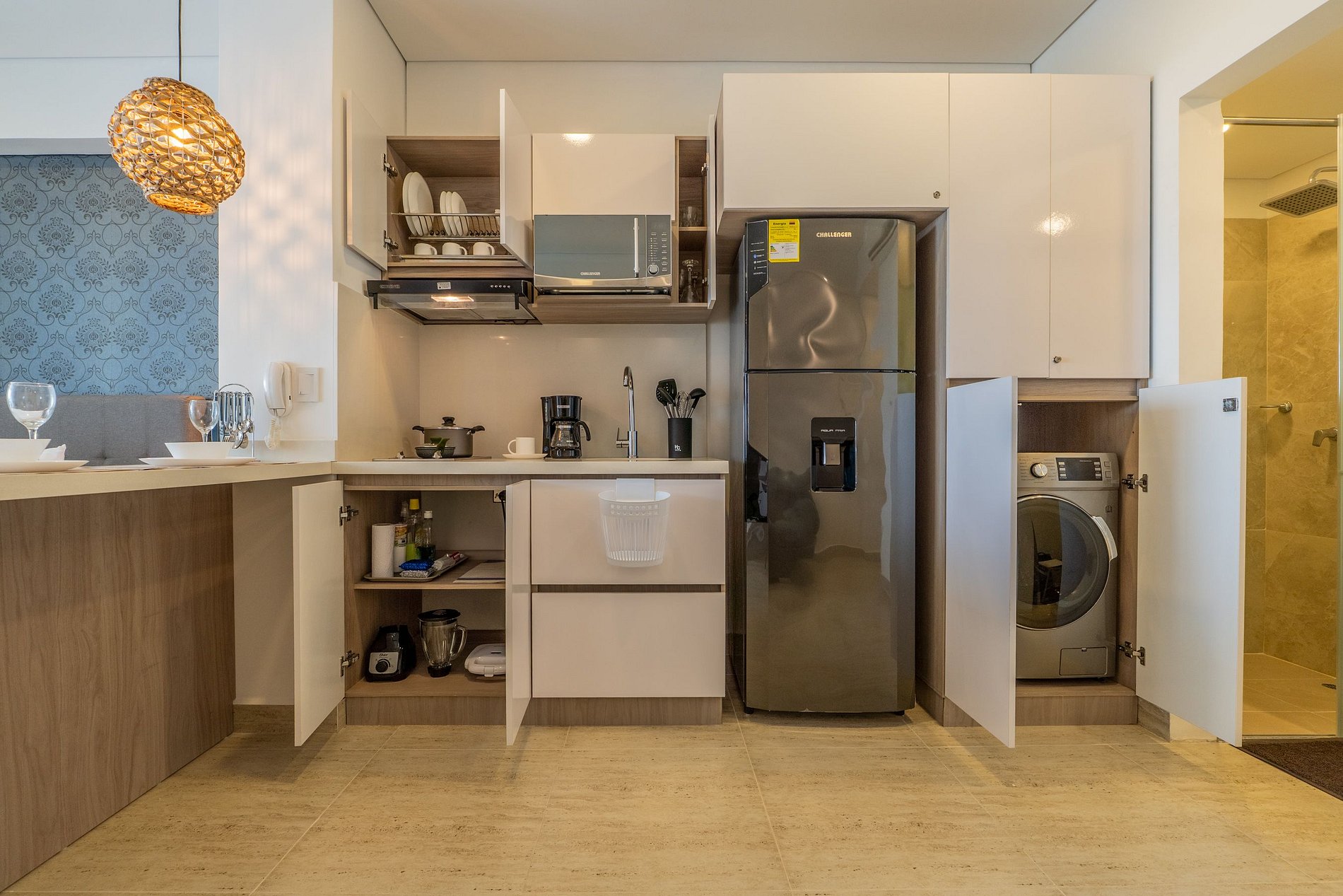 • Cocina moderna equipada con nevera, microondas, cafetera y menaje completo