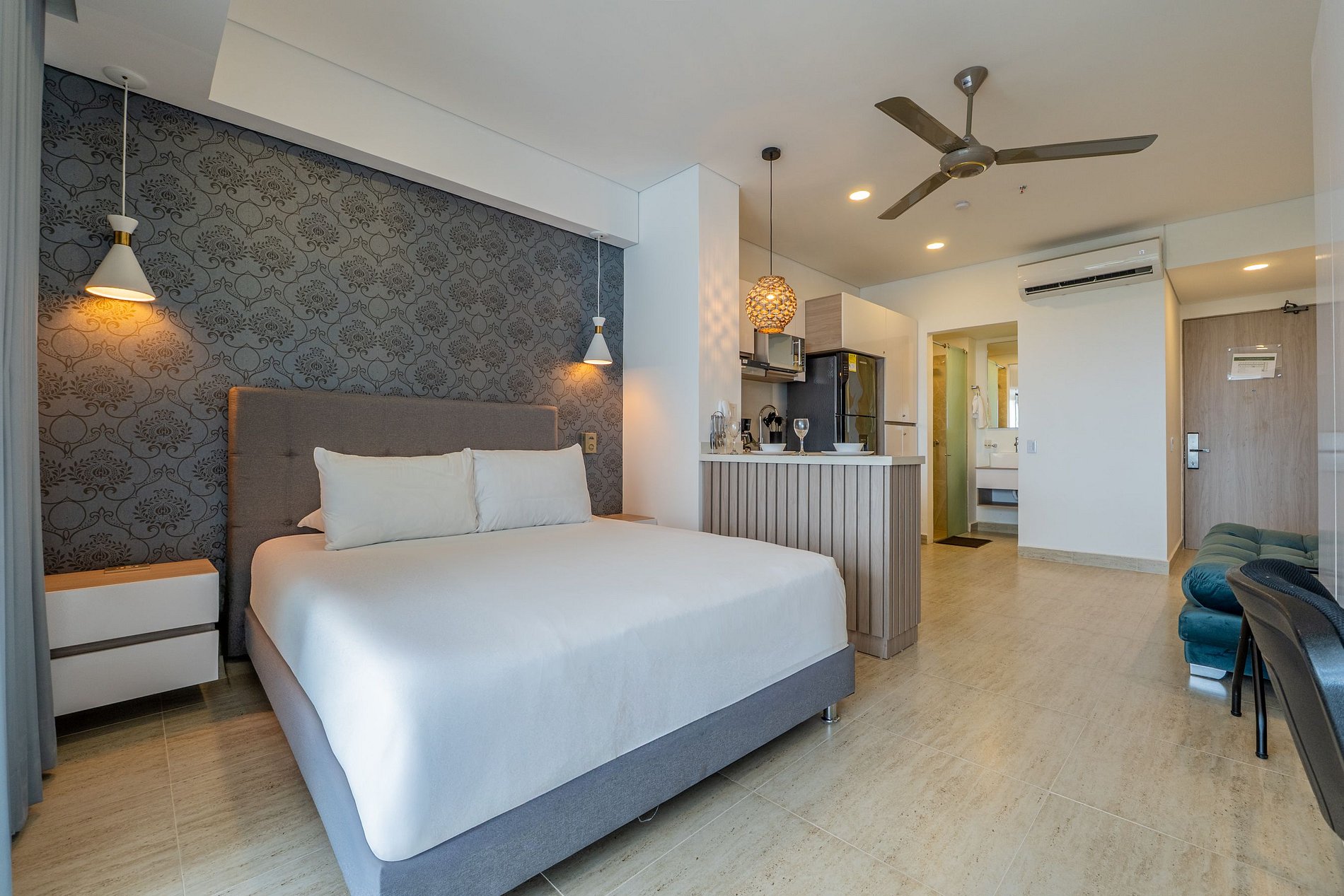 • Smart TV, aire acondicionado, ventilador y escritorio de trabajo