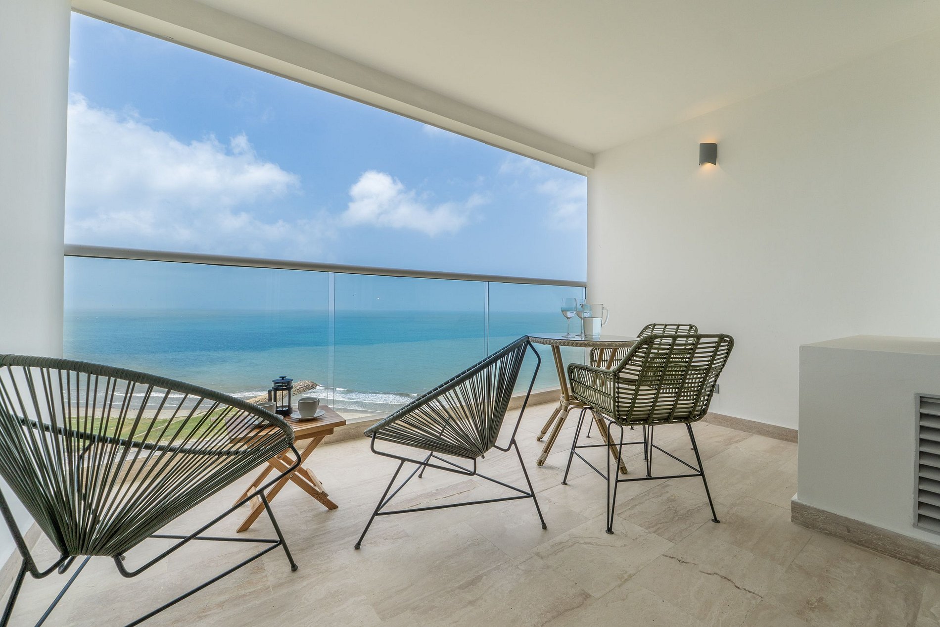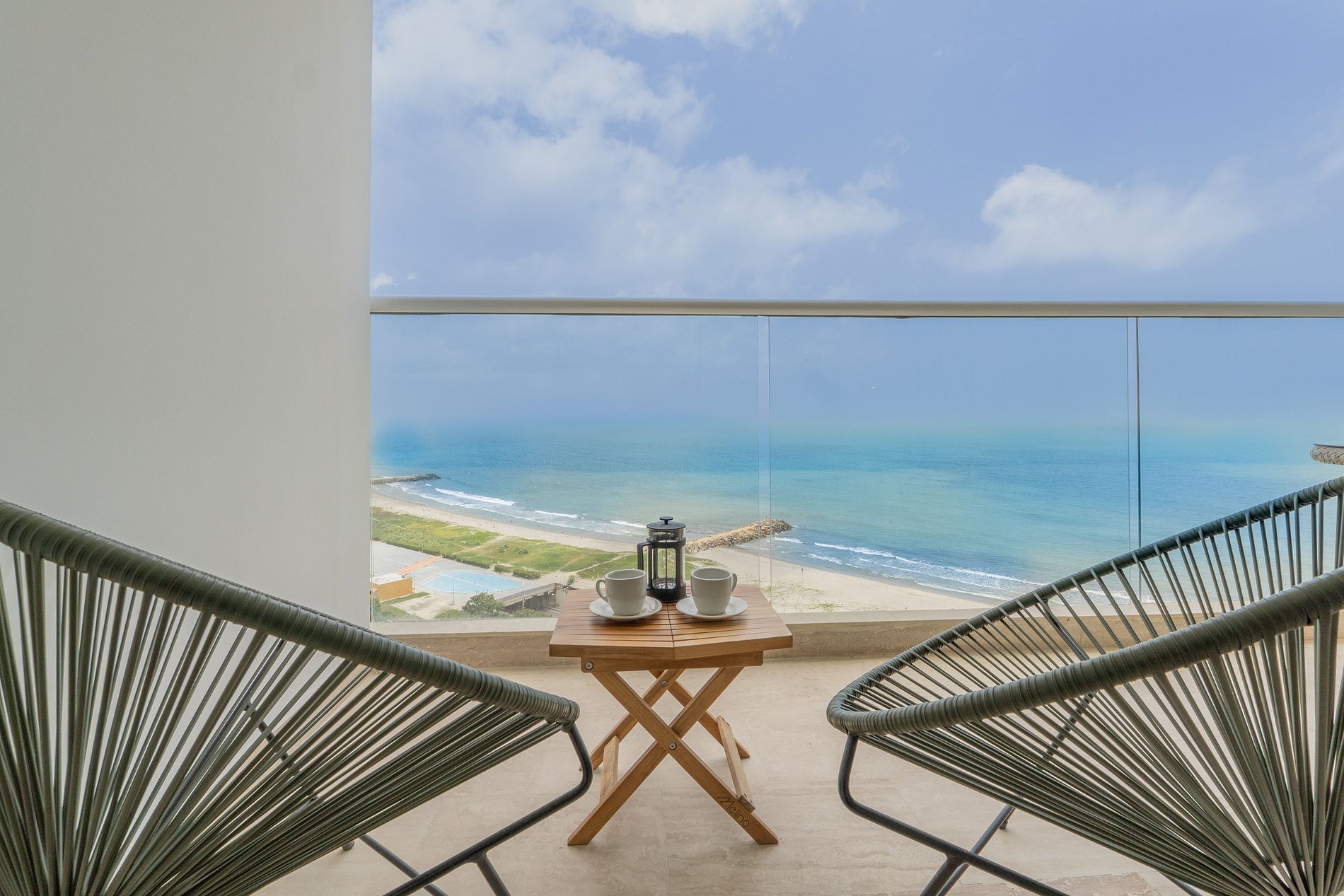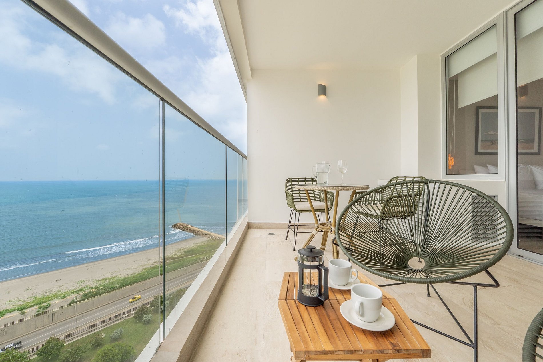 Disfruta de una estadía de lujo en esta suite frente al mar en el piso 15 del edificio Cartagena Beach. Con diseño moderno y elegante, cuenta con cama Queen, cocina equipada con barra, lavadora, baño contemporáneo y balcón privado con espectaculares vistas al mar. Relájate con aire acondicionado, Smart TV y wifi de alta velocidad. El edificio ofrece piscina semiolímpica, piscina infantil, jacuzzi y seguridad 24/7, en una ubicación estratégica cerca del aeropuerto y del centro histórico.
