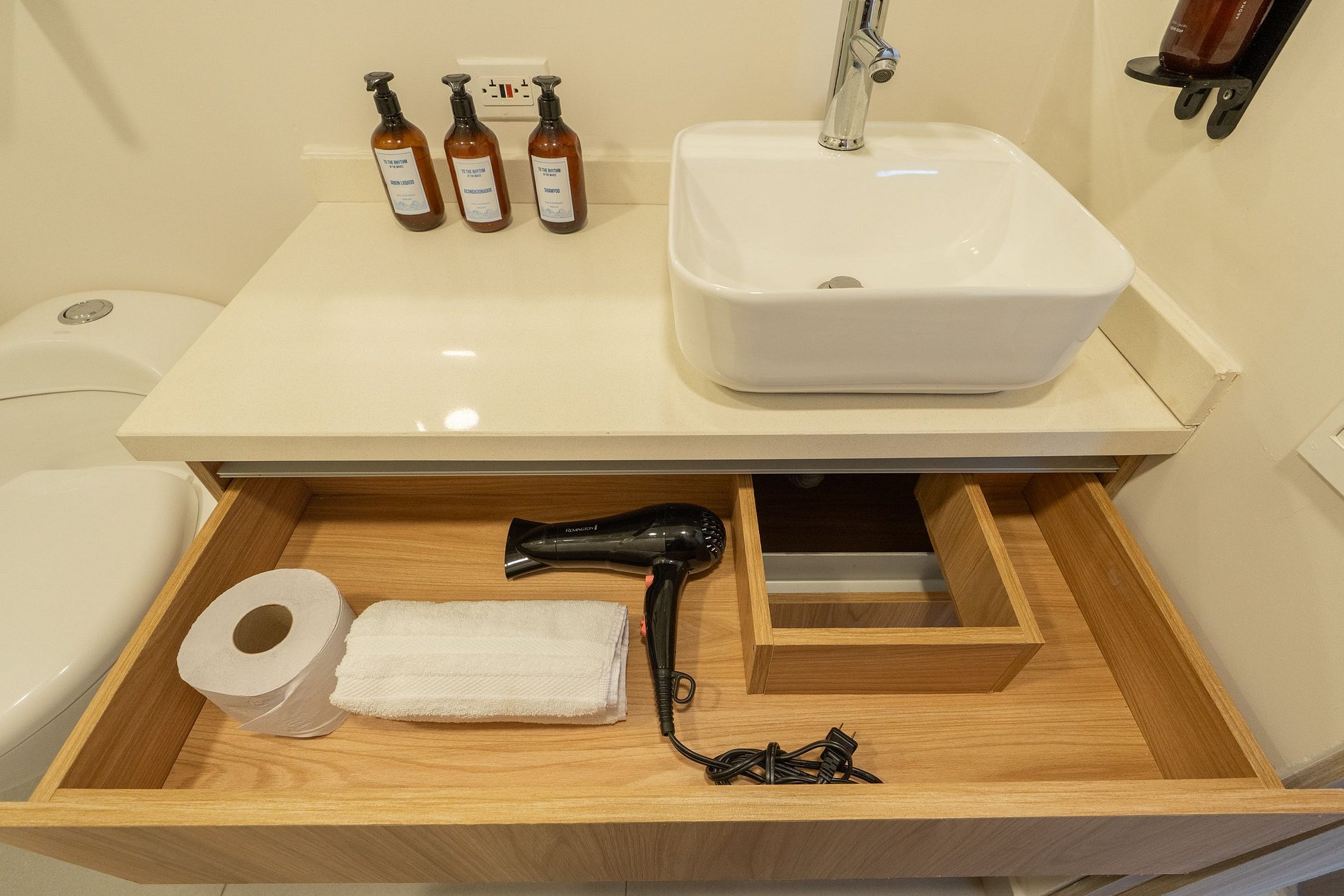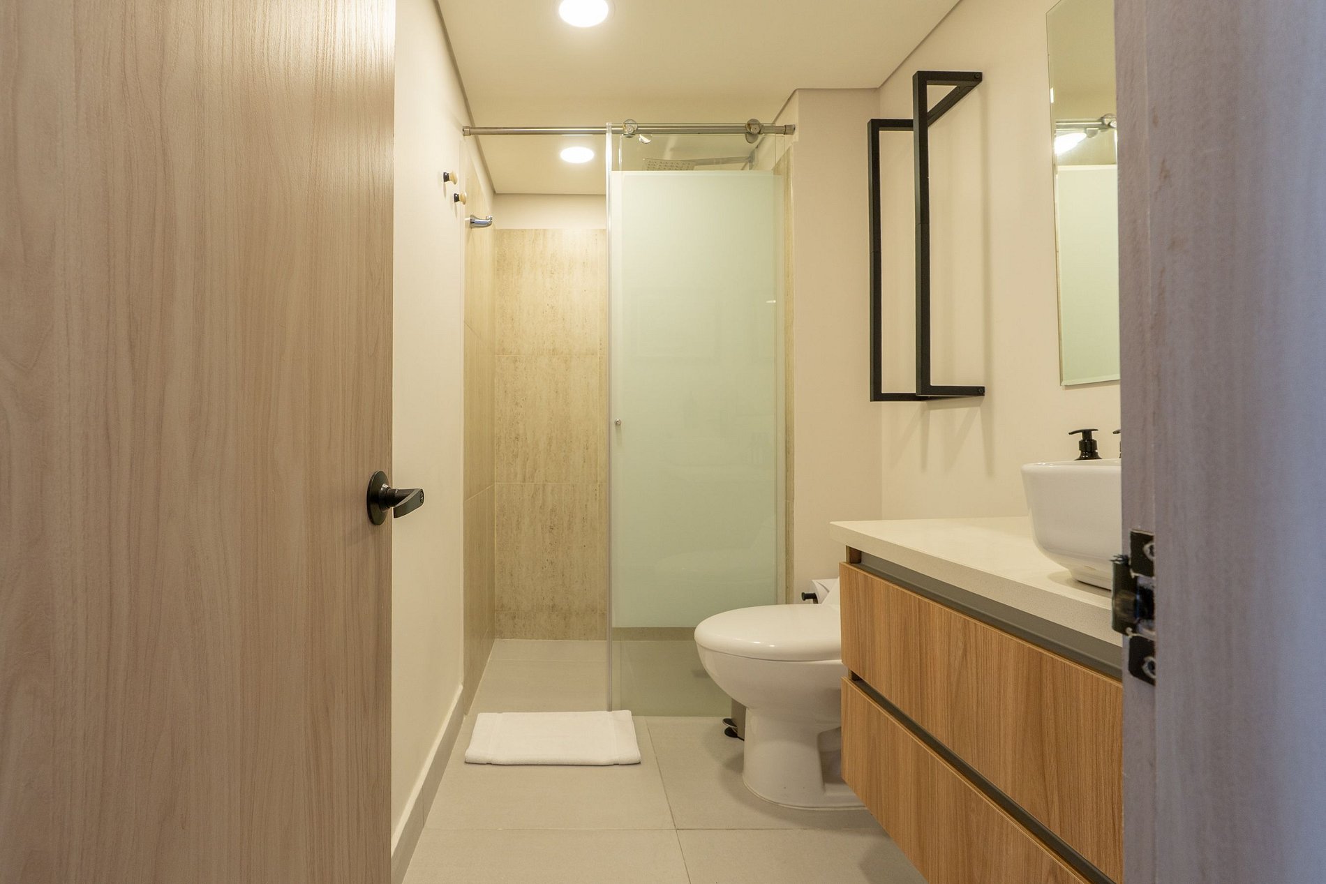 • Baño elegante con ducha en vidrio, lavamanos de diseño y amenities