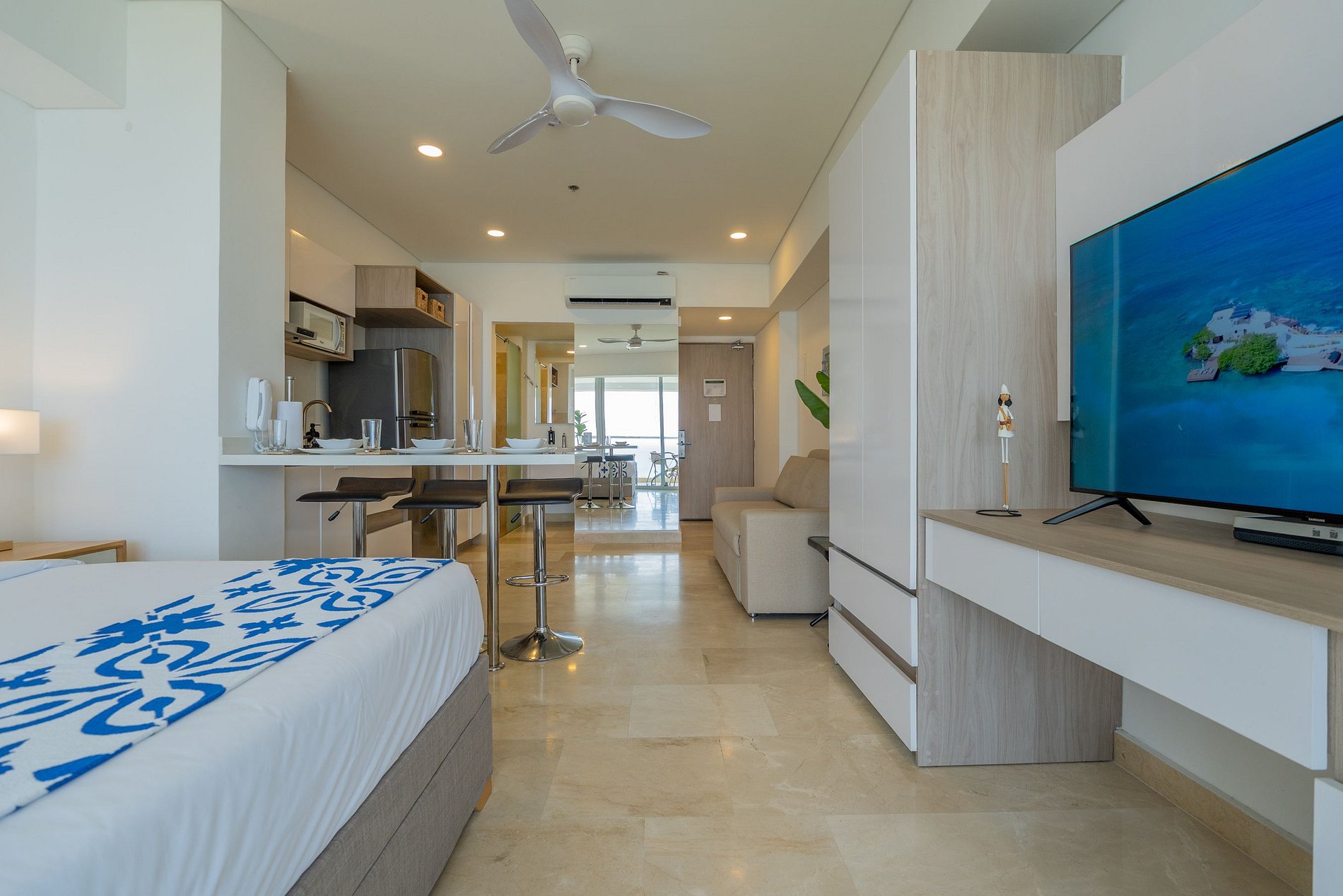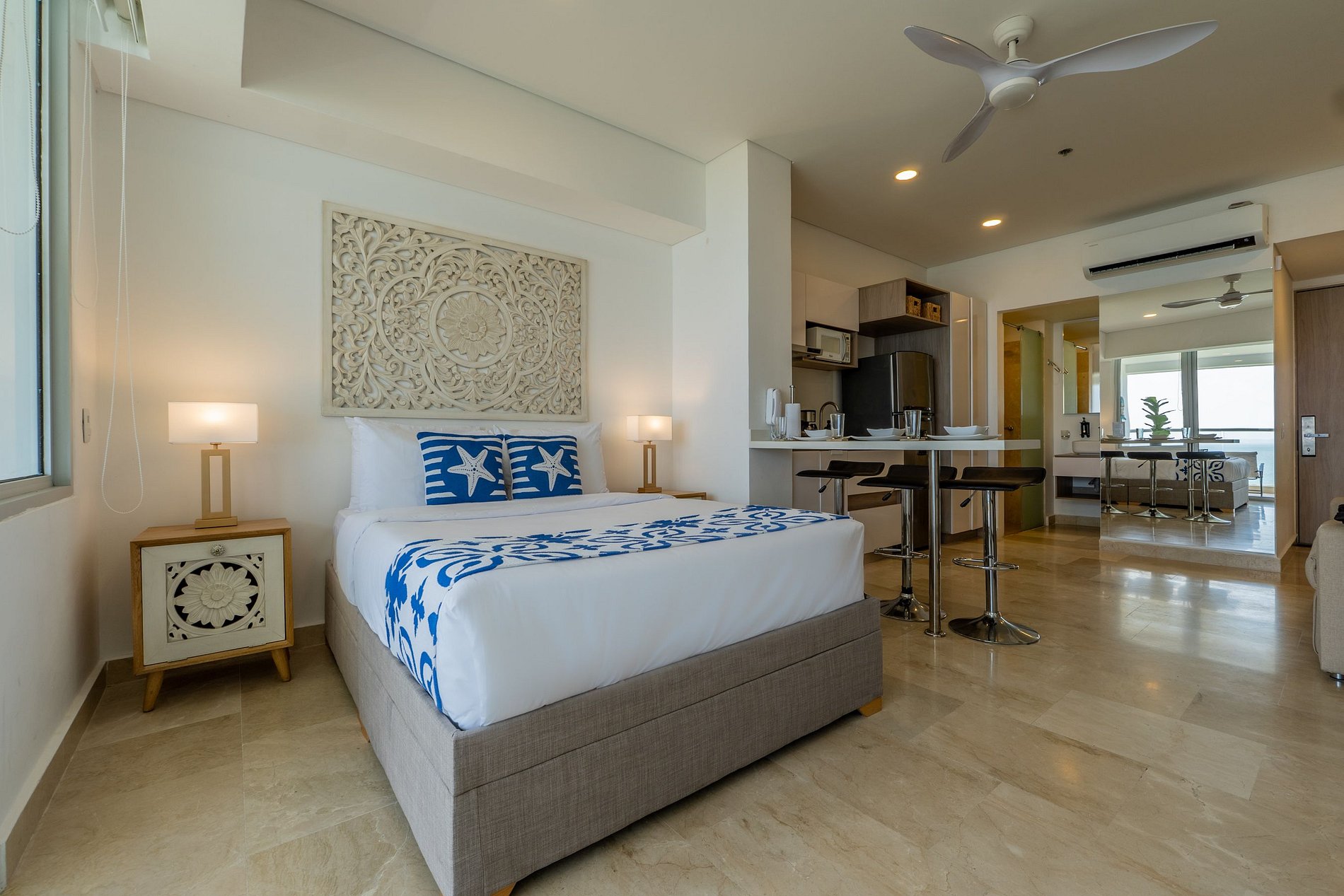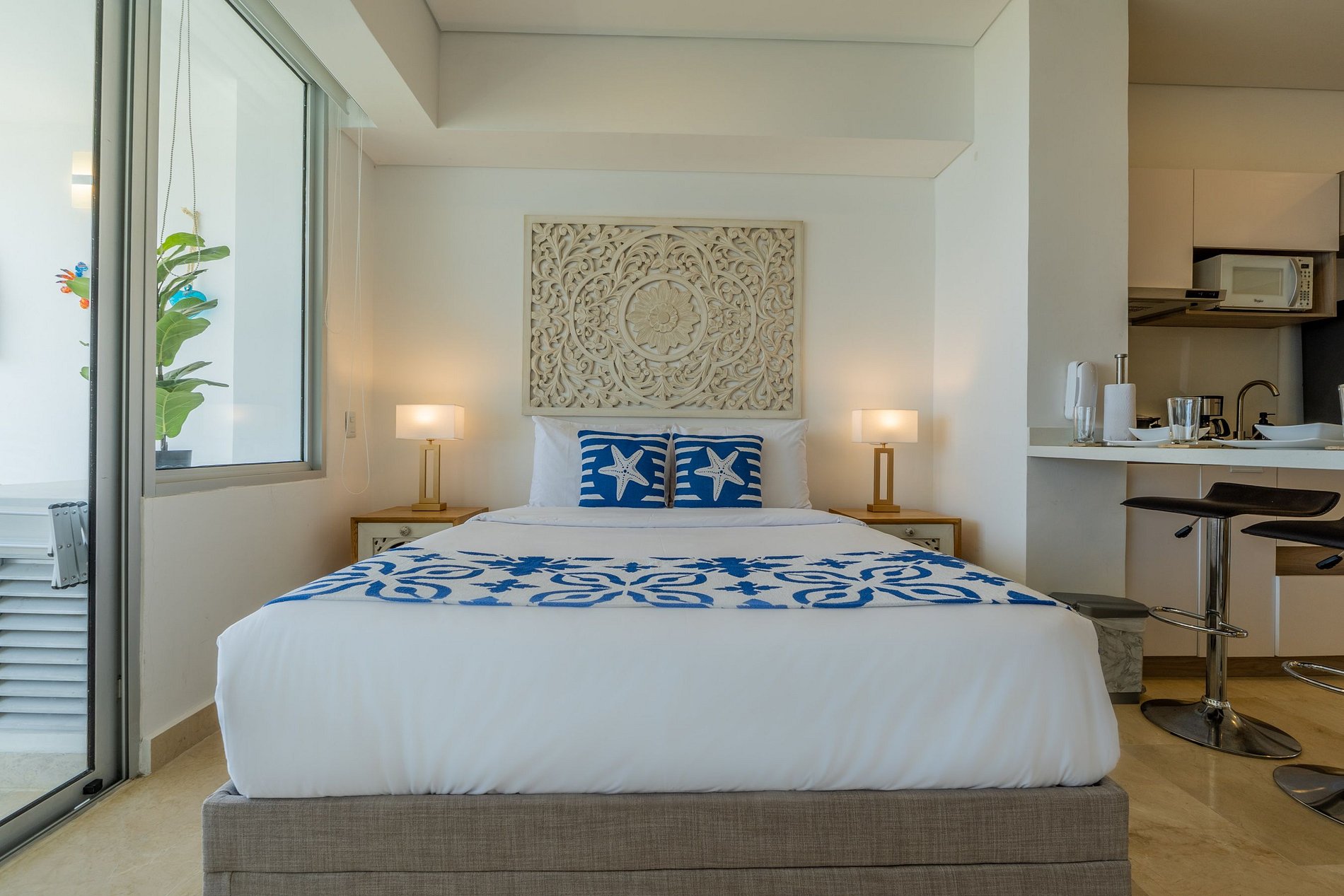 Suite en piso 9 de Cartagena Beach con balcón amoblado y vistas al mar, la Ciénaga y la ciudad. Espacio moderno con cama Queen, sofá cama, sala luminosa con Smart TV y aire acondicionado. Cocina equipada con nevera, microondas, cafetera, licuadora, menaje y comedor. Baño moderno con ducha tipo lluvia. Edificio con piscina grande y solárium, jacuzzi, sauna, turco y lobby con recepción y seguridad 24 h. Junto al parque lineal y playas de Crespo, a 3 min del aeropuerto y cerca del centro histórico